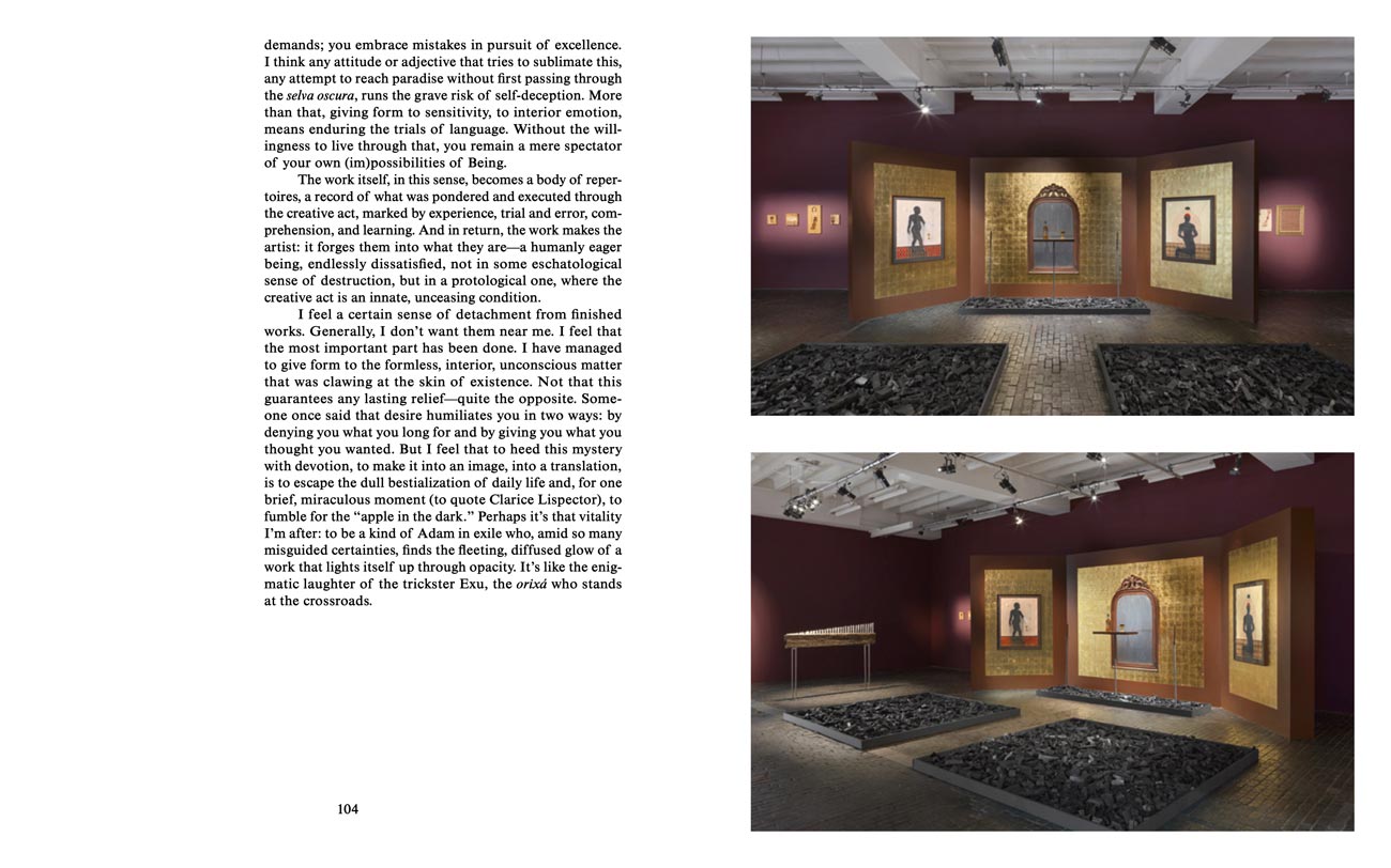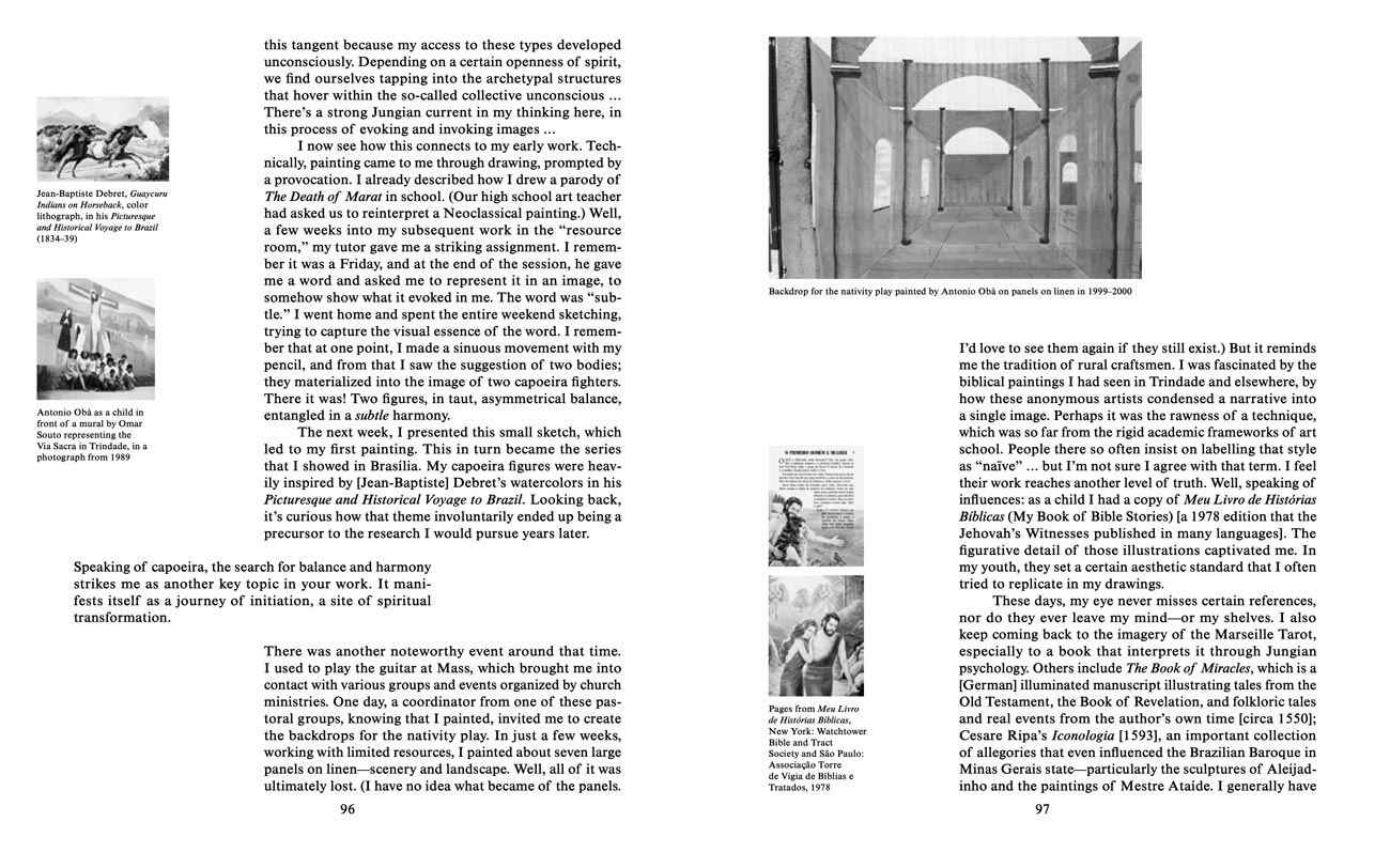 The conversation between Andrea Bellini and Antonio Obá that opens the book offers the opportunity to learn, through the artist's voice, about the key passages of his research, and to examine his diverse cultural references—from the Baroque of Minas Gerais to traditional Chinese painting, from Rembrandt to the Catholic ex-votos—until we discover the Obá's civic vocation, of painting as a spiritual practice.
