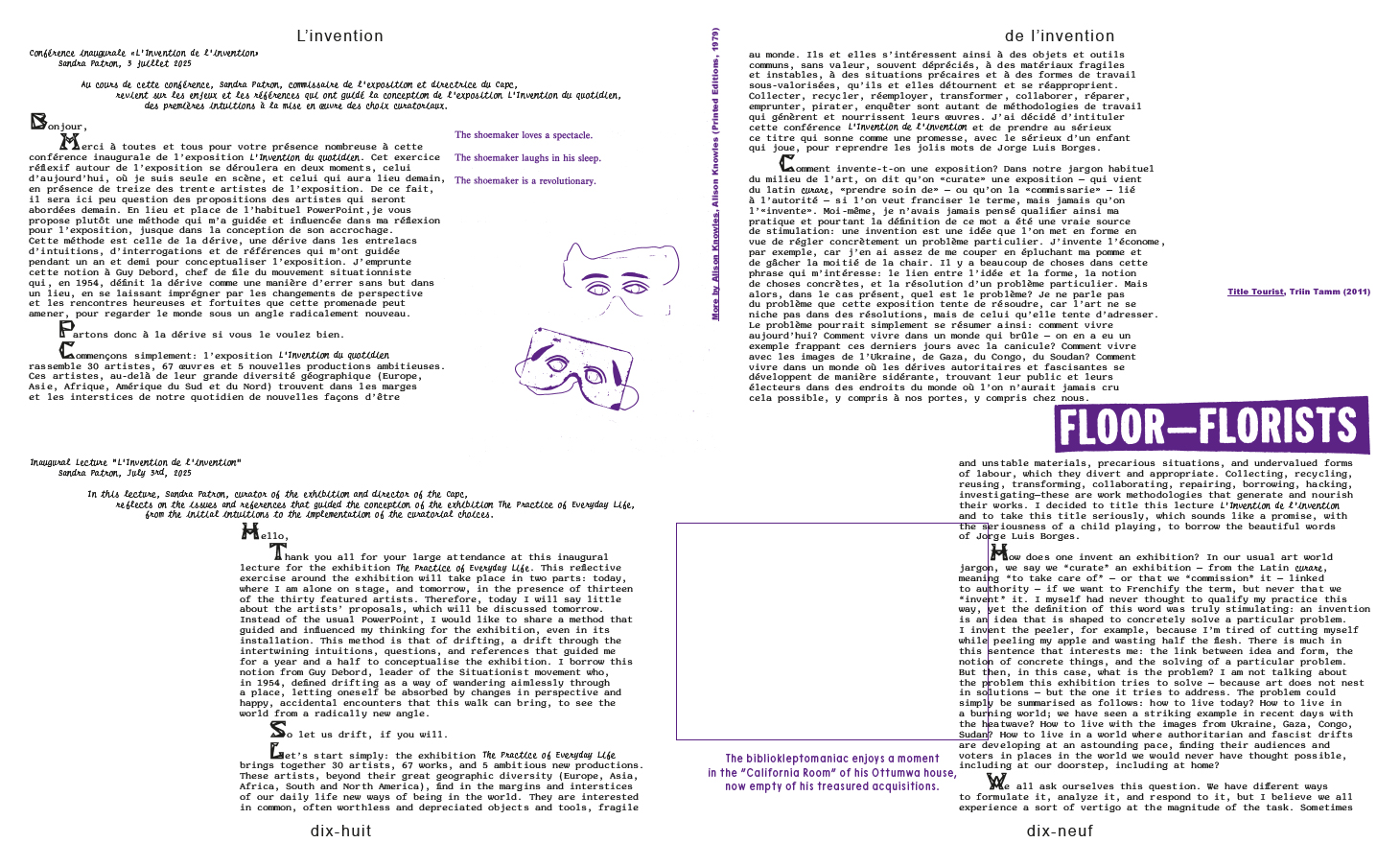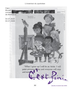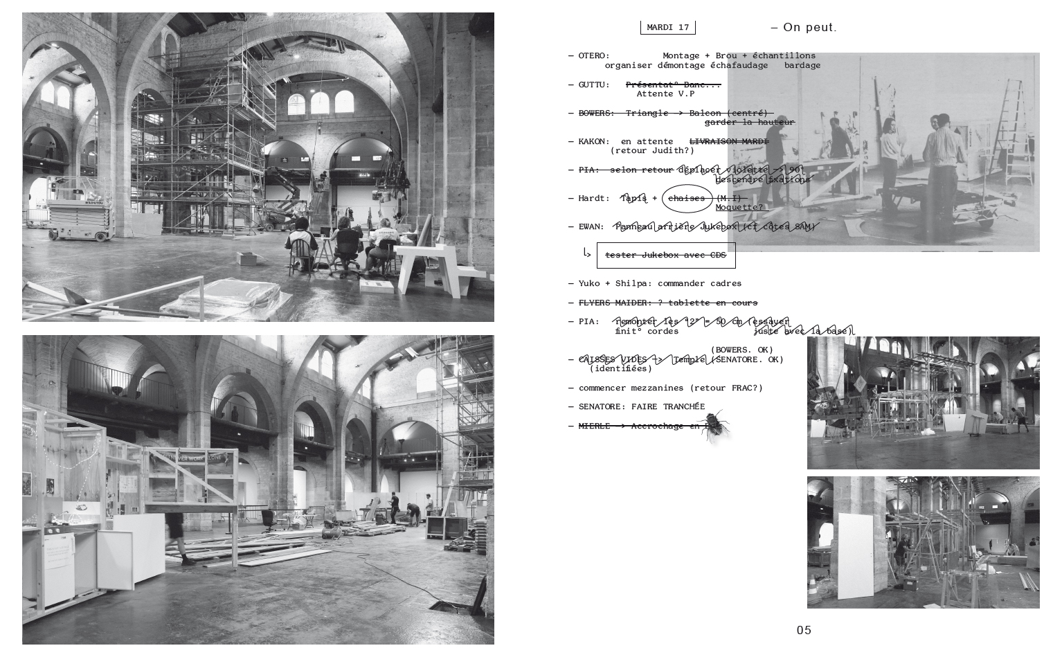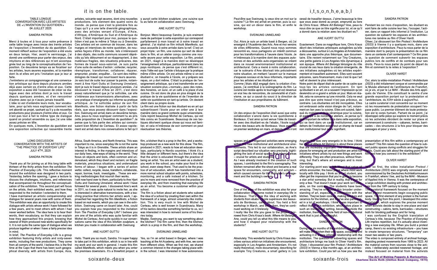 Structured in three parts, this graphic, narrative, and theoretical object unfolds through the release of three newspapers, distributed at different stages of the exhibition. The first, published on the day of the opening, documents the installation of the exhibition, as well as the work of the artists and technicians. The second, published a few weeks later, presents Sandra Patron's lecture and the long table discussion with thirteen of the thirty artists. The third, released in the autumn, reflects on workshops conducted with the public, involving puppets and the visual lexicon created with the graphic designers.