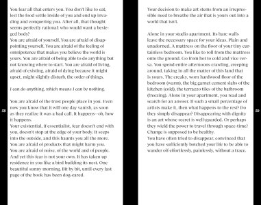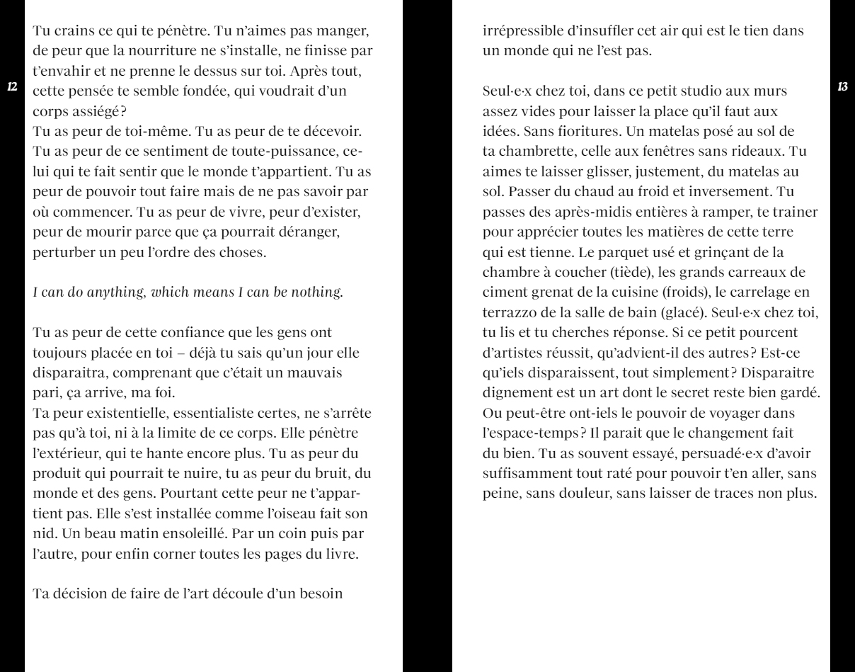 You fear all that enters you. You don't like to eat, lest the food settle inside of you and end up inva- ding and conquering you. After all, that thought seems perfectly rational: who would want a besie- ged body? You are afraid of yourself. You are afraid of disap- pointing yourself. You are afraid of the feeling of omnipotence that makes you believe the world is yours. You are afraid of being able to do anything but not knowing where to start. You are afraid of living, afraid of existing, afraid of dying because it might upset, might slightly disturb, the order of things.
