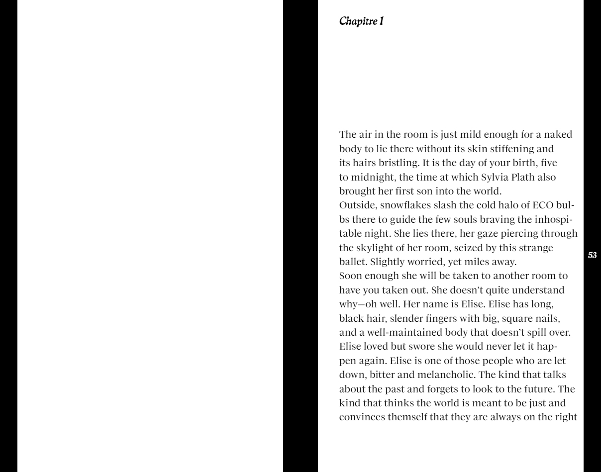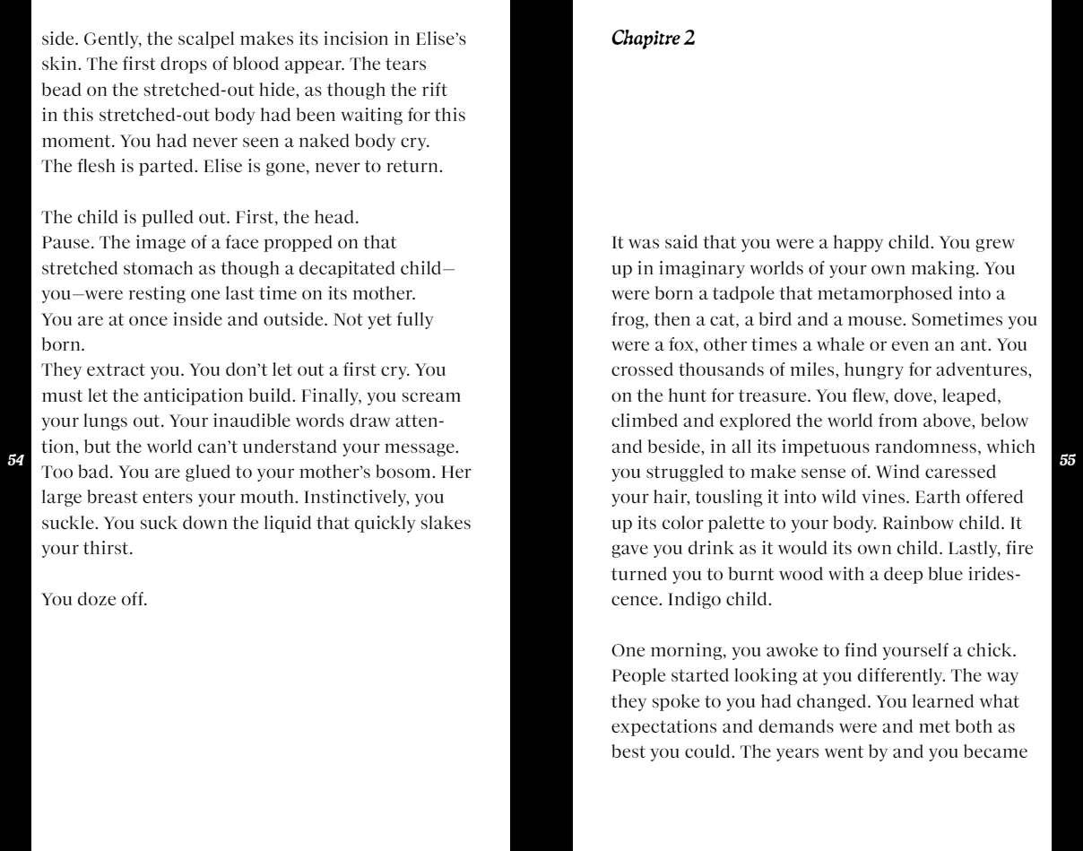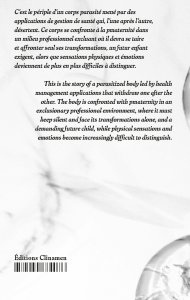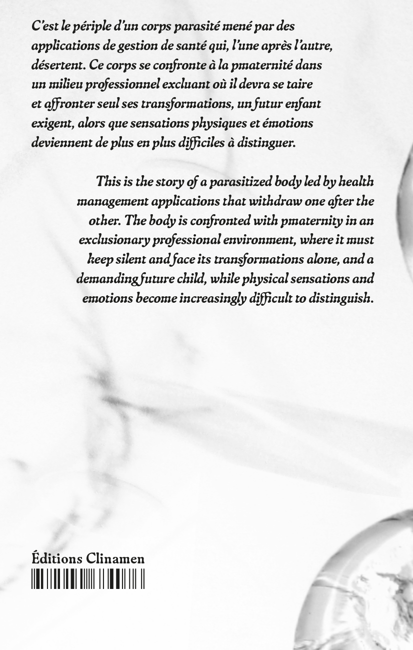 This is the story of a parasitized body led by health management applications that withdraw one after the other. The body is confronted with pmaternity in an exclusionary professional environment, where it must keep silent and face its transformations alone, and a demanding future child, while physical sensations and emotions become increasingly difficult to distinguish.