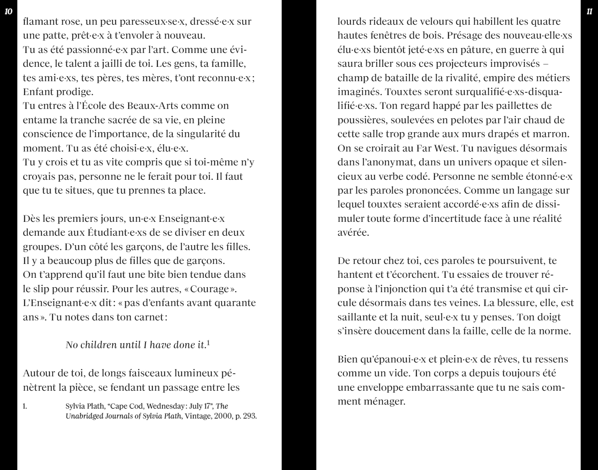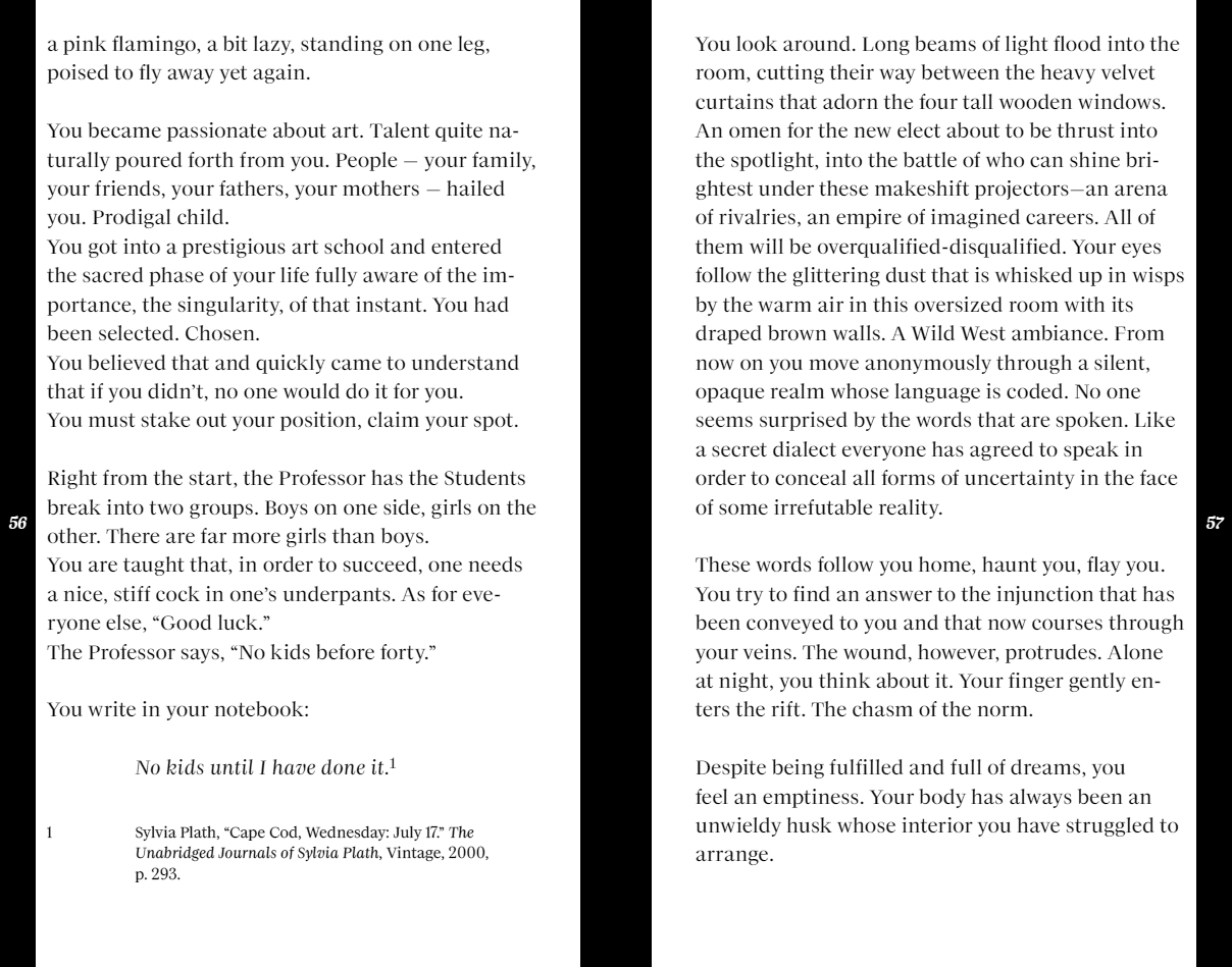 A text by the Swiss artist, imbued with highly personal reflections on her relationship with creativity, notions of gender, motherhood, and the place of parenthood in the world of work (more specifically, the tensions inherent in the dual role of mother and artist).