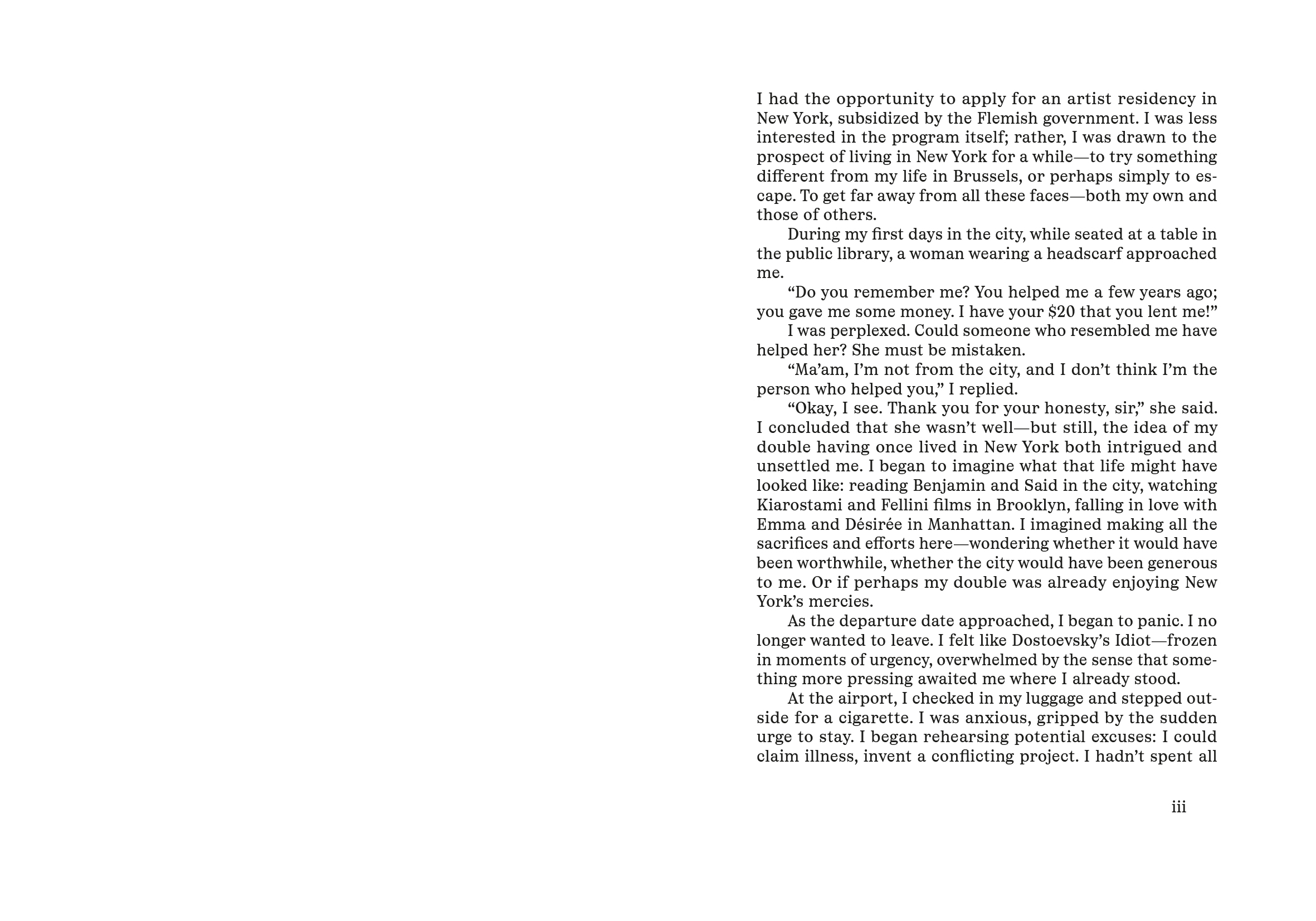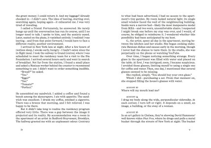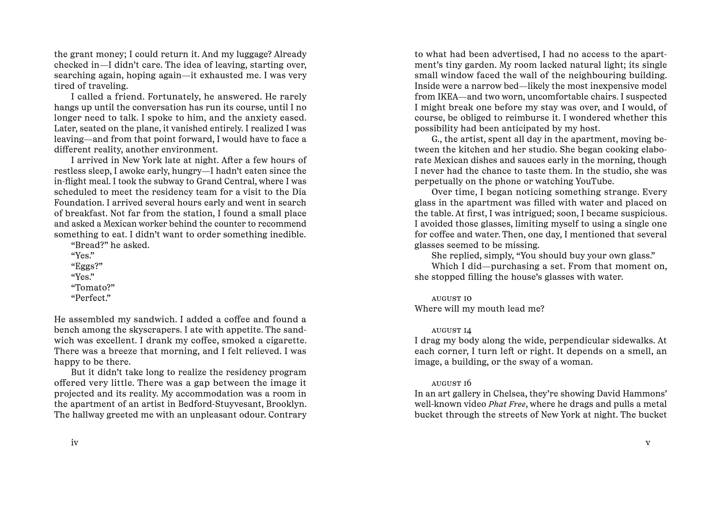 Where will my mouth lead me? This question arises already in the first days of Hamza Halloubi's residency in New York. It characterises his diary entries from August to November 2024. He observes the art world, comments on cultural and political events and thinks about writers and artists who have long intrigued him and what his body and their ideas are doing in this city–and what this city does not do to him and them: David Hammons,