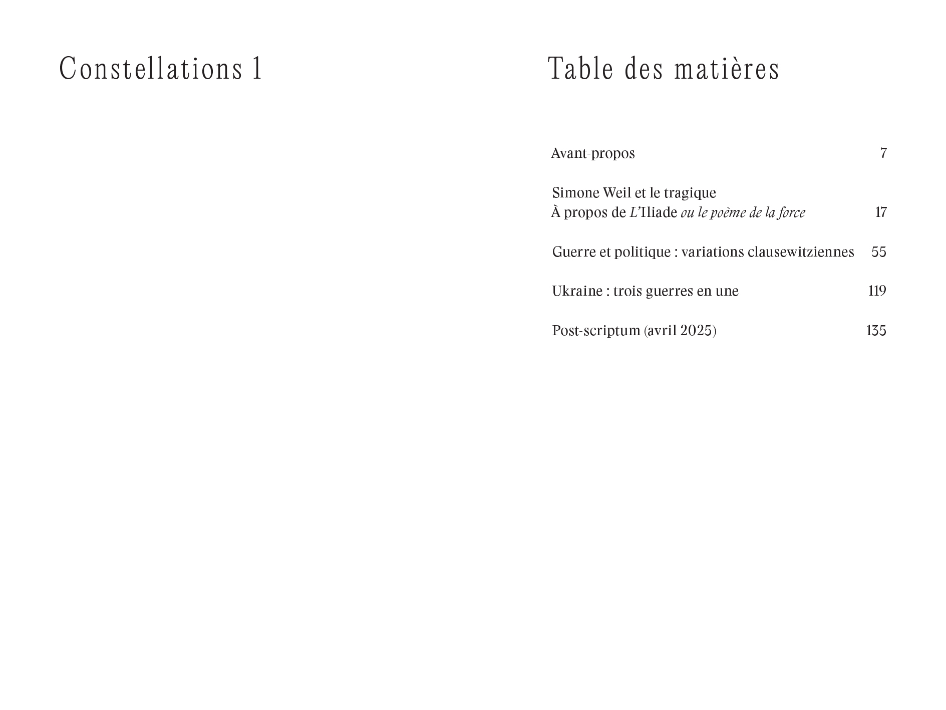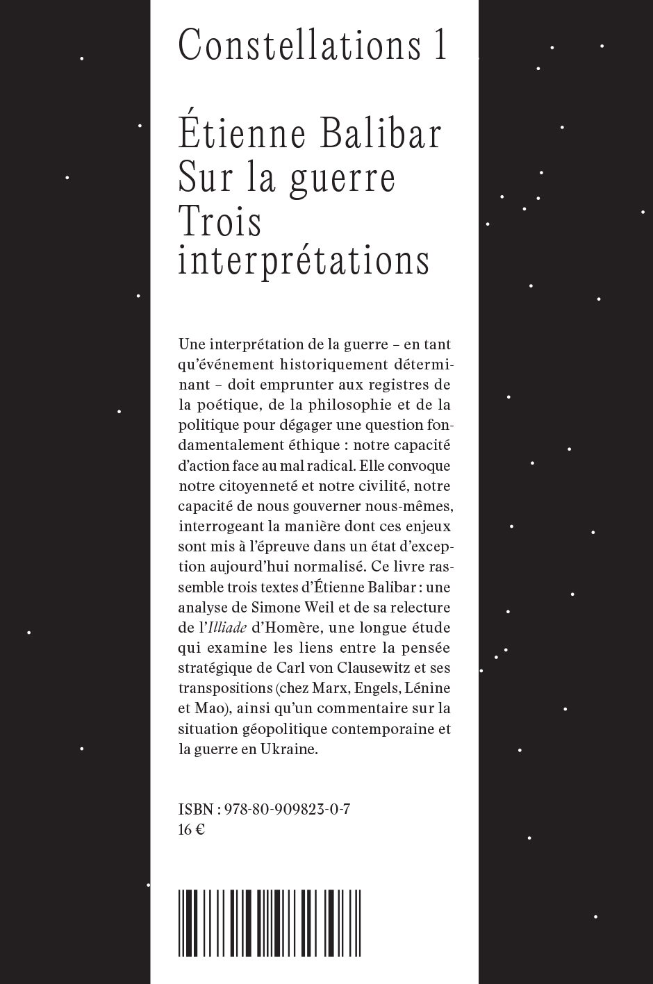 Sur la guerre [On War], the first volume in the "Constellations" series of short essays, contains three reflections by Étienne Balibar on war, which are highly relevant today. The book brings together an analysis of Simone Weil and her reinterpretation of Homer's Iliad, a lengthy study examining the links between Carl von Clausewitz's strategic thinking and its Marxist readings (by Marx, Engels, Lenin, and Mao), and a commentary on the contemporary geopolitical situation and the war in Ukraine.