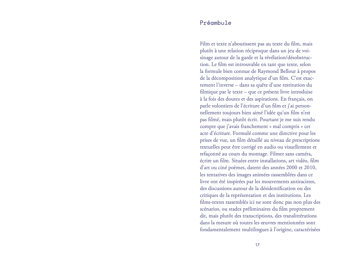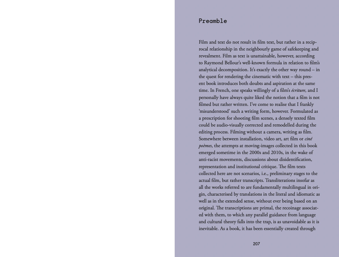 The works collected for this publication span installation, video art, and ciné-poems, emerging from anti-racist movements and debates around disidentification, representation, and institutional critique—through the medium of moving images.