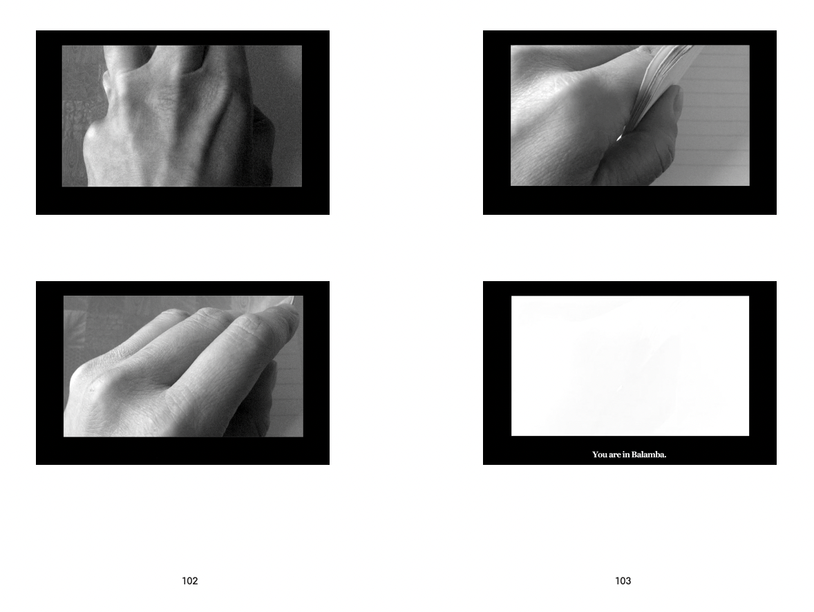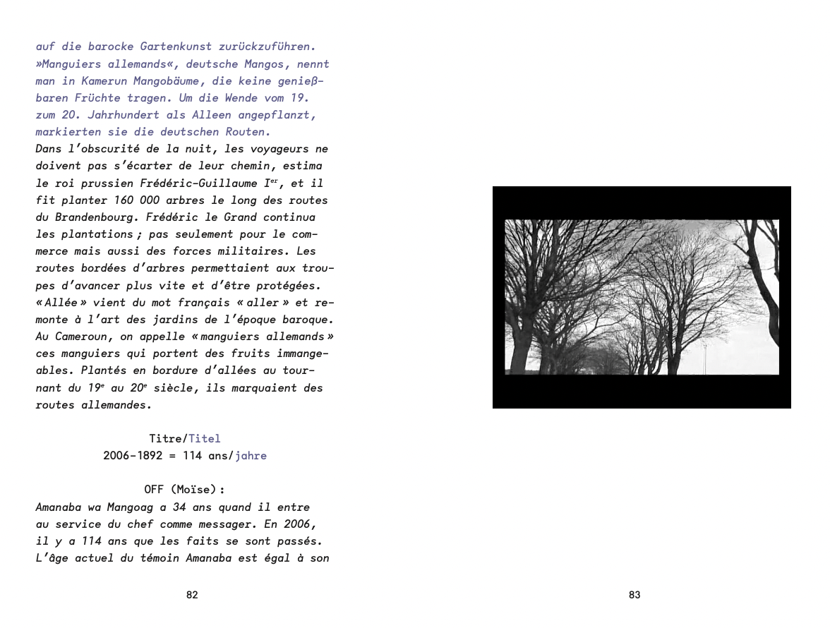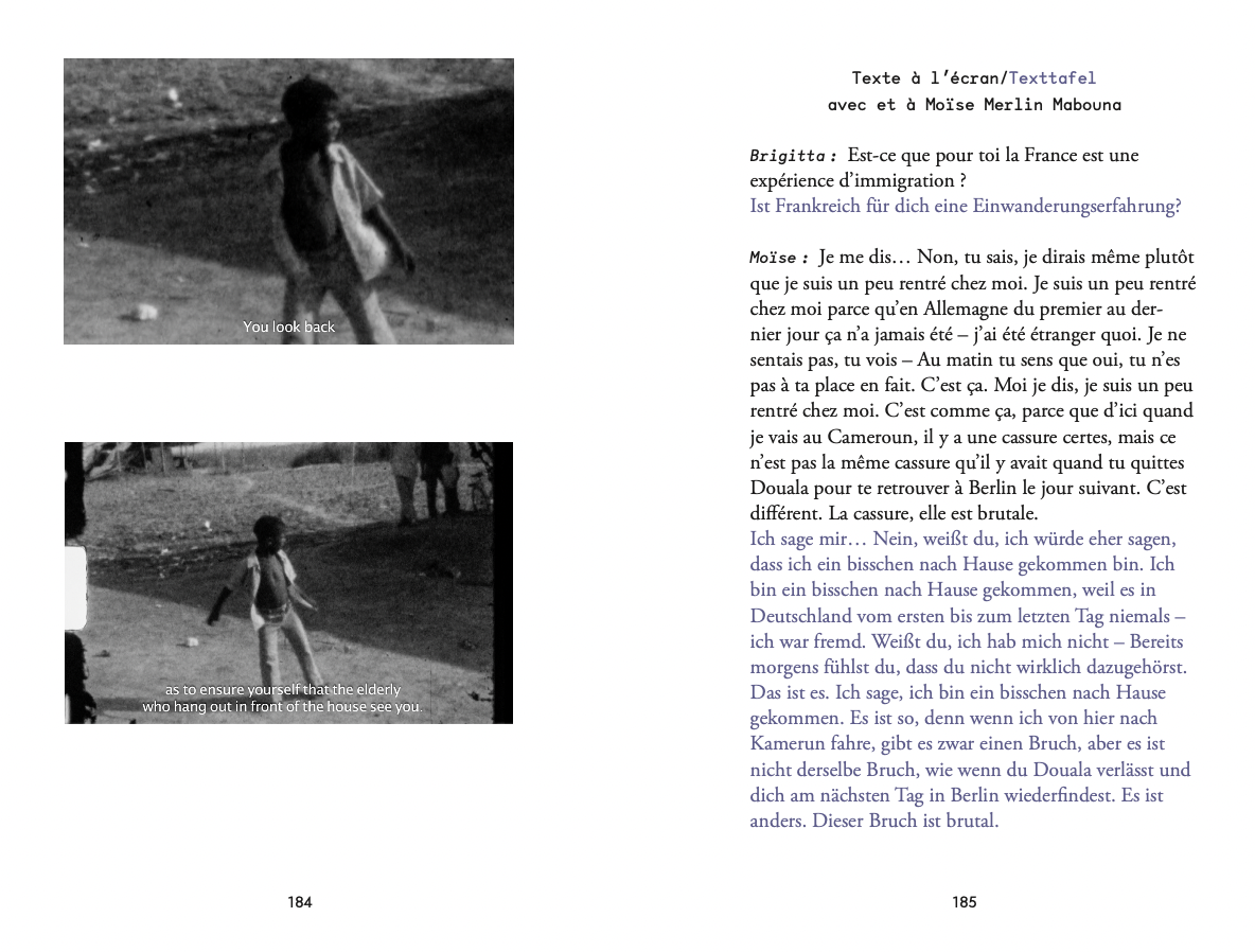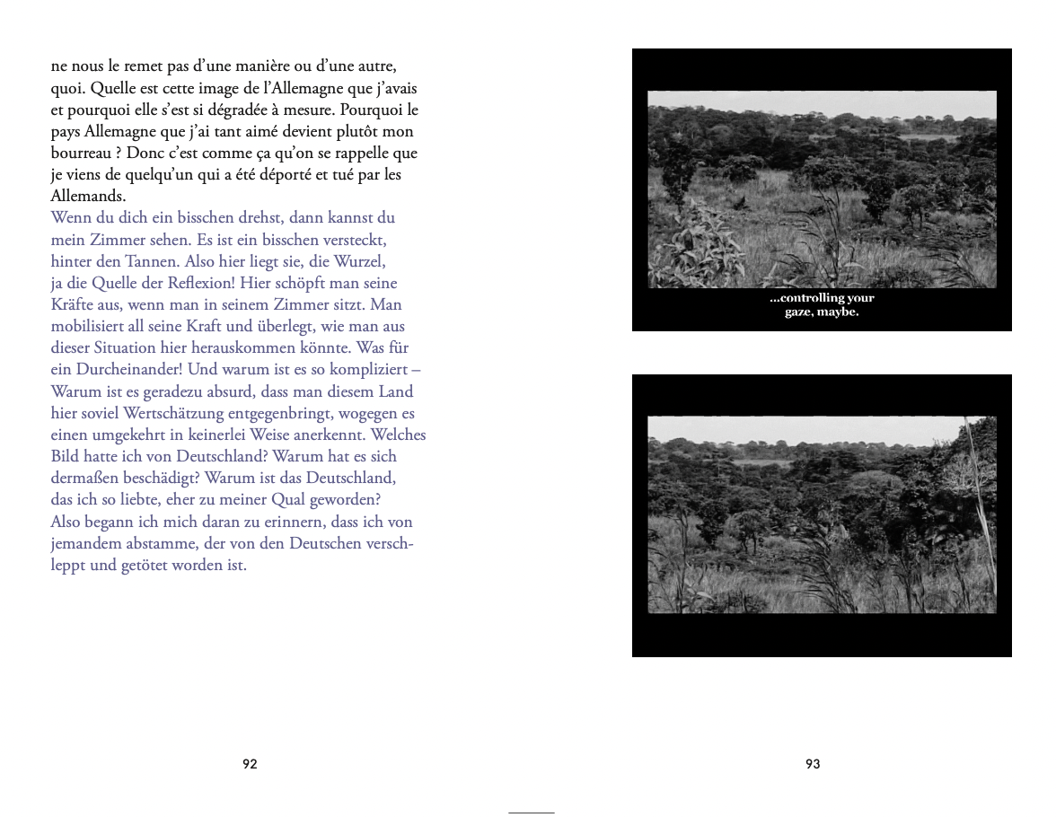 A monographic publication featuring multilingual text-film transcripts engaging with the legacy of the German colonial project in Cameroon and Germany, as well as broader questions of border crossings, asylum, and exclusion.