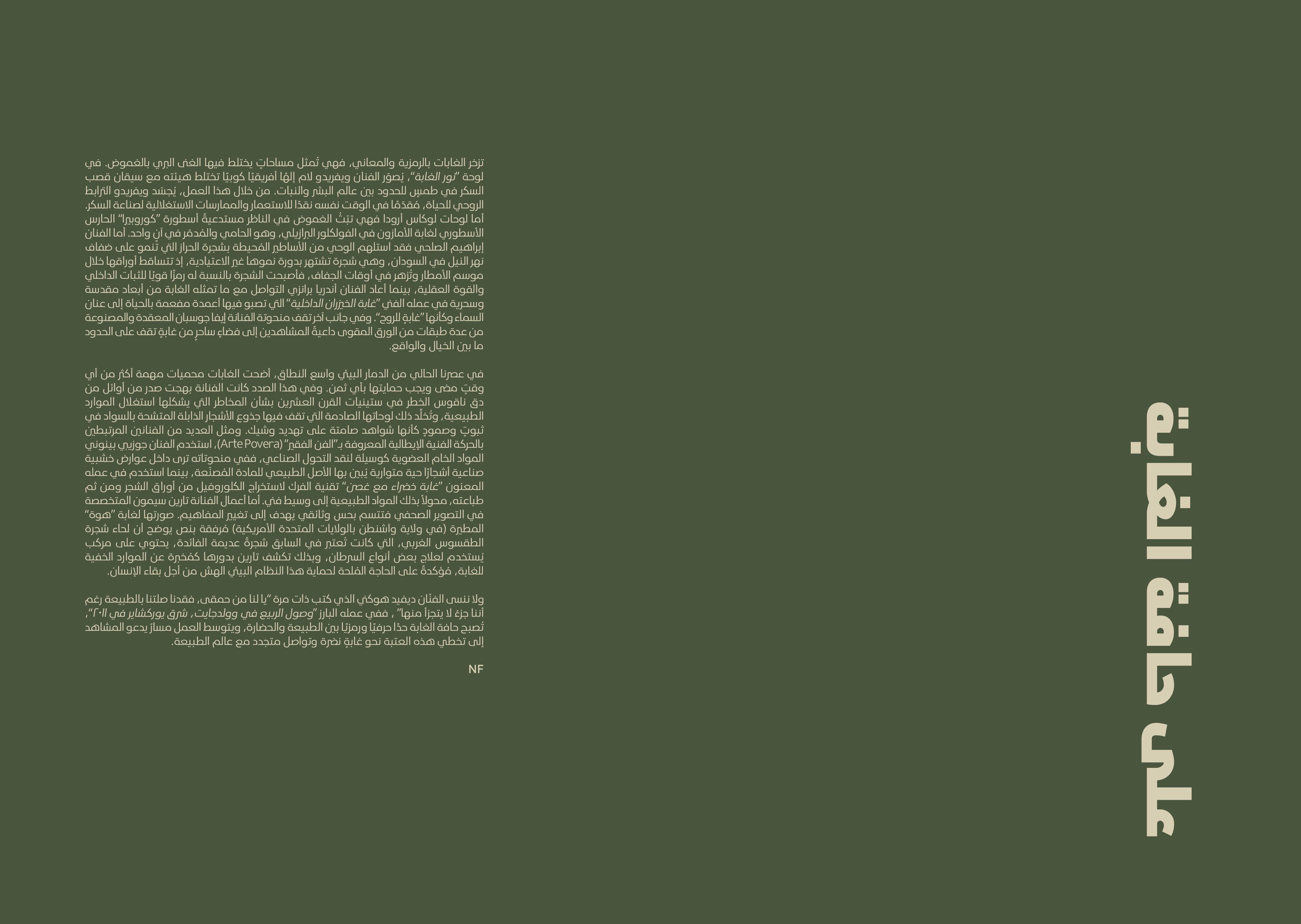 Drawing inspiration from the site of AlUla, uses the allegory of the garden to reveal how modern and contemporary artists explore our evolving relationship to nature and the land. Organised into six chapters, the exhibition delves into nature's multiple manifestations, both real and imagined, on a journey through gardens, forests, deserts and their constellatory reflections in the cosmos. Through showcasing compelling and thought-provoking artworks, the exhibition tackles challenges the world encounters today, examining notions of the threat of climate change, migratory displacement, the spread of urbanization, and the Anthropocene, defined as the age of humanity's profound impact on the planet.