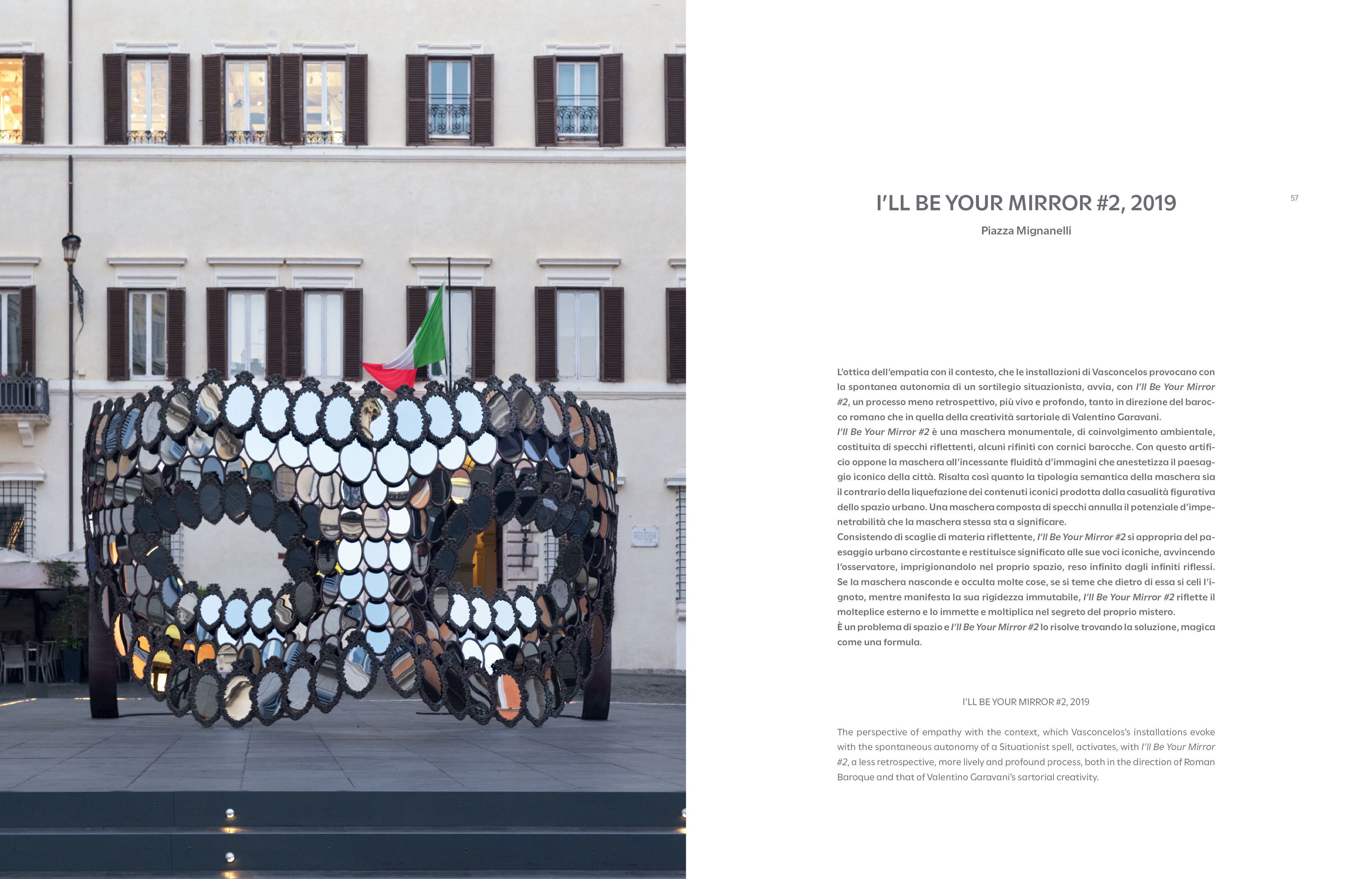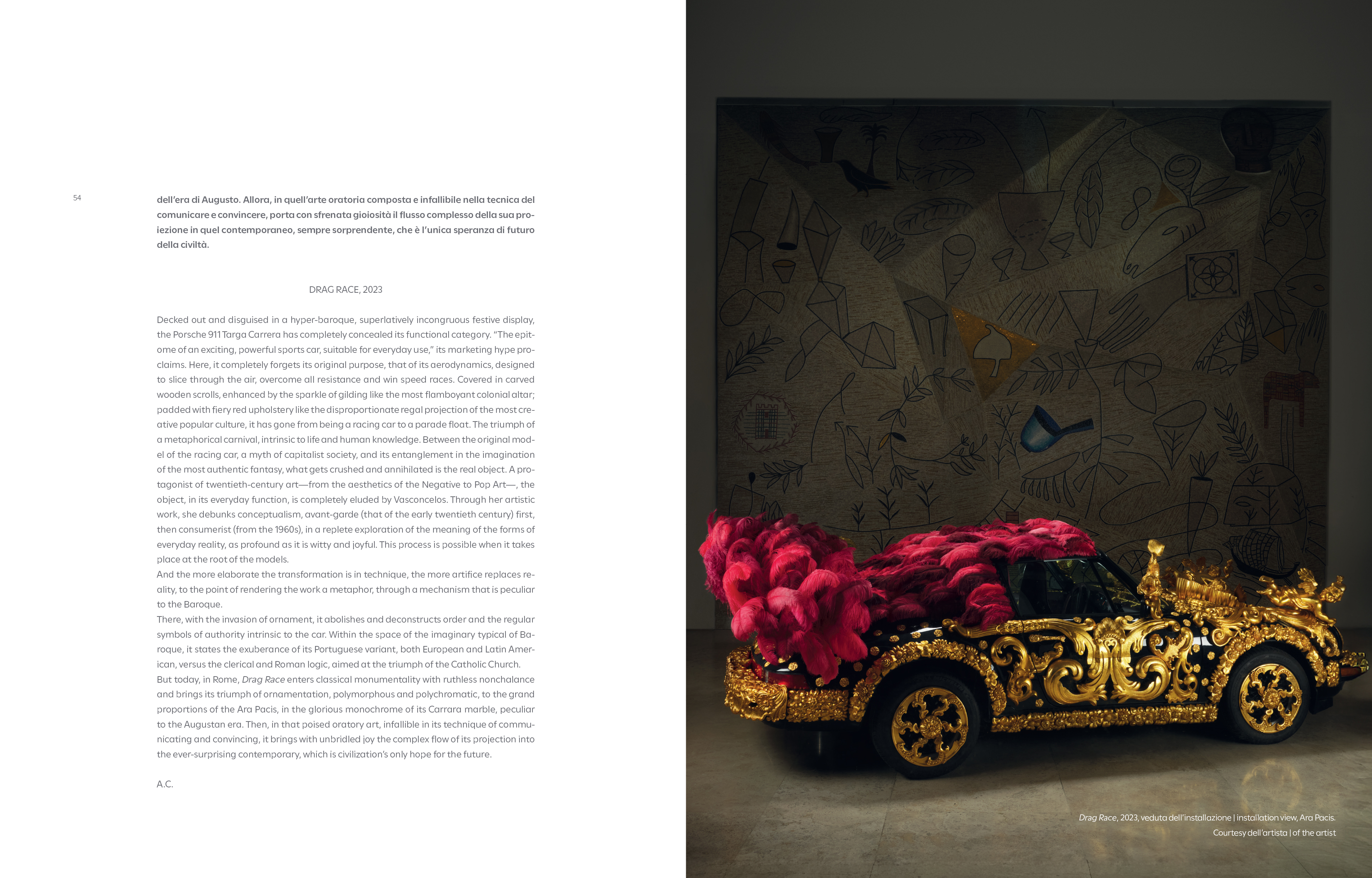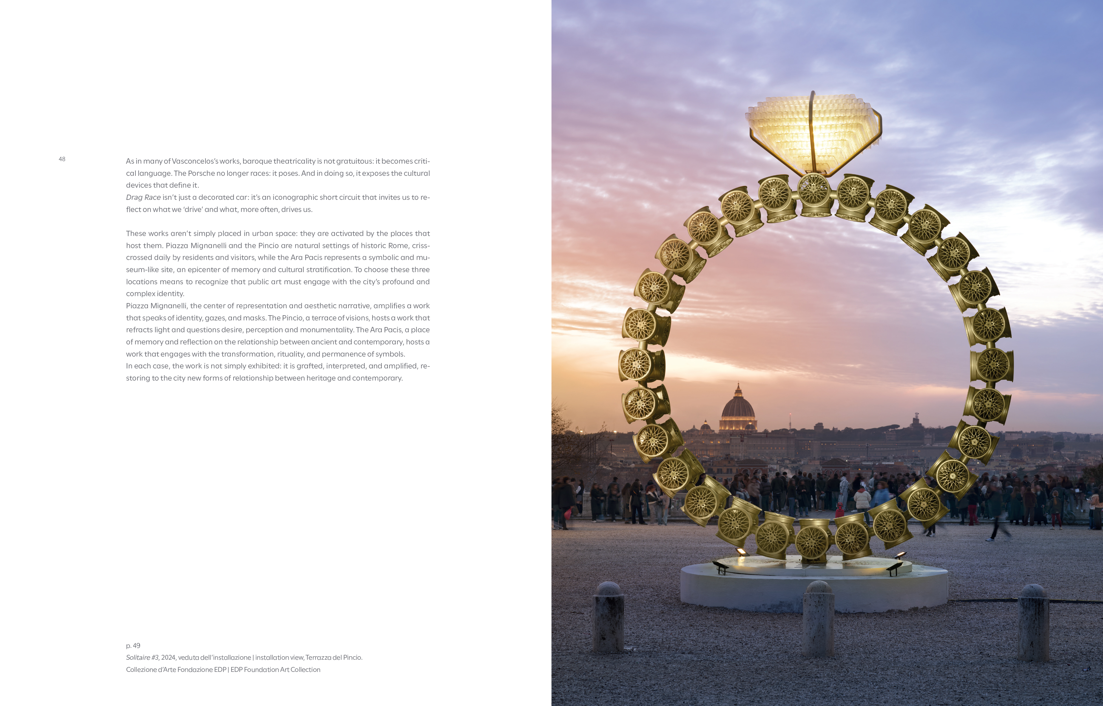 Edited by Pamela Golbin, with texts by Pamela Golbin, Anna Coliva, Giulia Silvia Ghia, Daniele Luchetti, and Lucia Milazzotto, the volume combines critical essays, visual documentation, and narrative materials that situate Vasconcelos's work within the historical and symbolic landscape of Rome and within broader reflections on ornament, the baroque, and the politics of display. A special project by Daniele Luchetti, developed specifically for the book, extends the exhibition into a parallel cinematic and testimonial dimension, recording the voices and experiences of the communities involved and anchoring the project in a social reality.