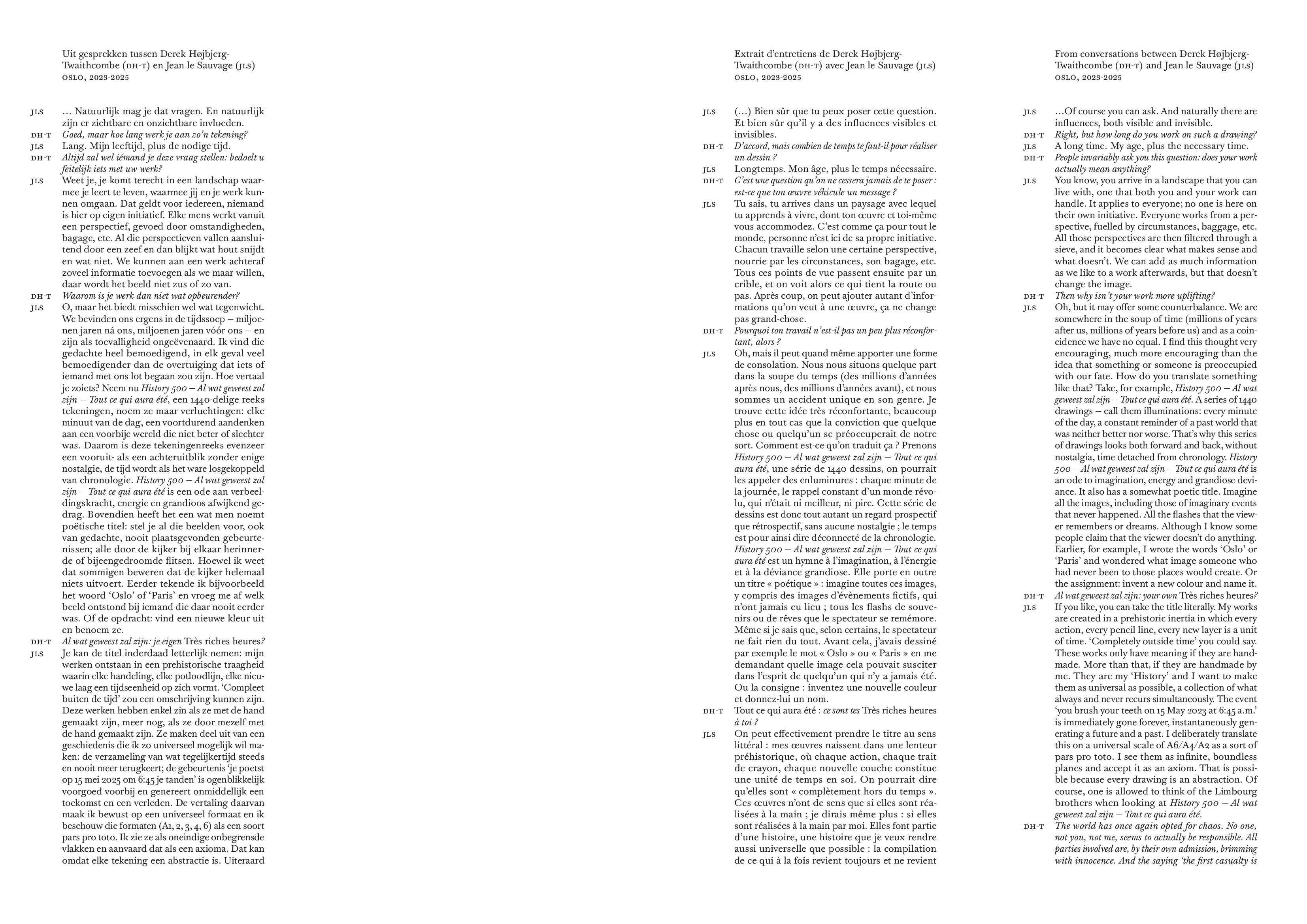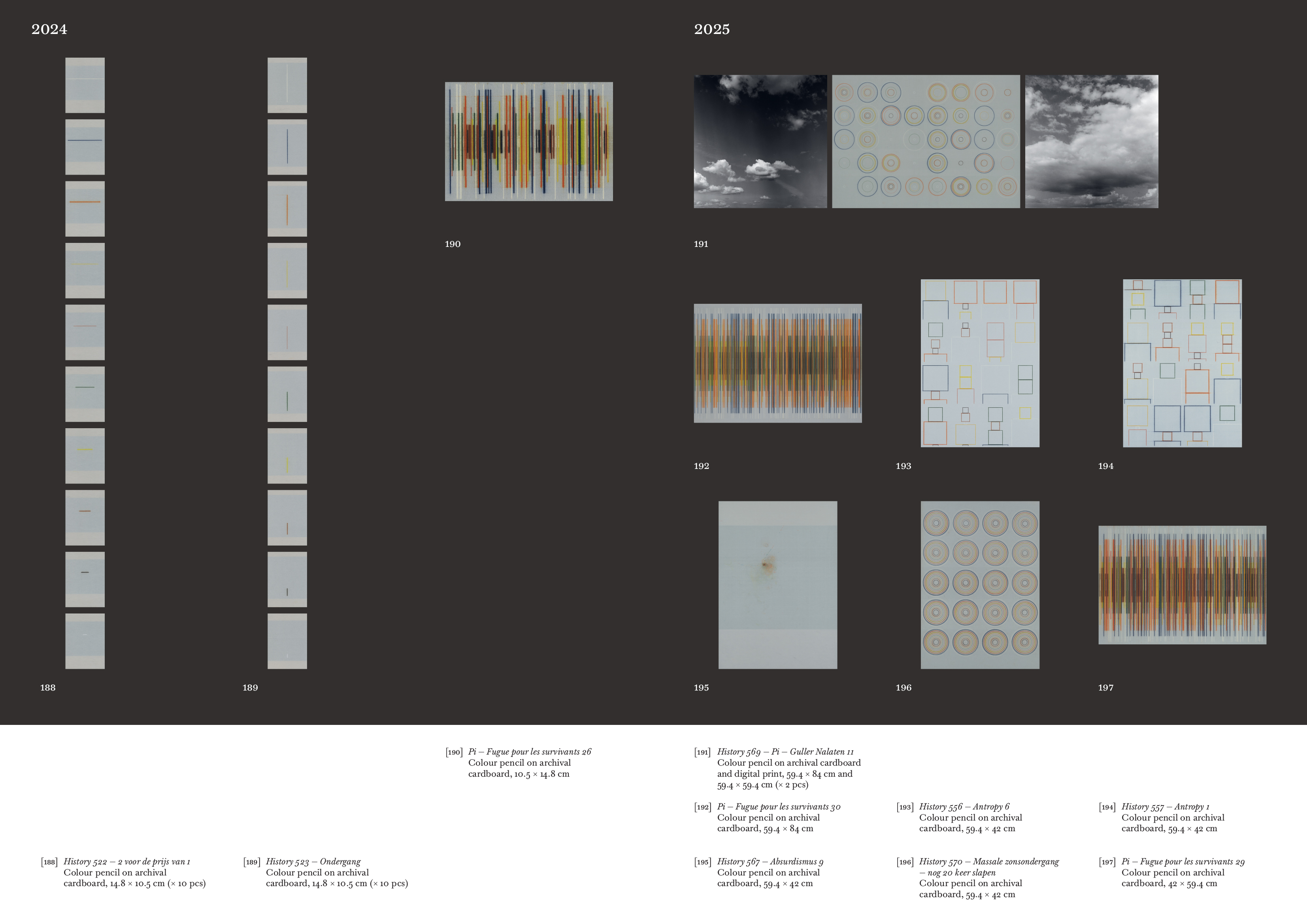 This book is the fourth volume of the Hands of Time series and covers De Wilde's new works from the period 2021–2025. Titled Les très riches heures de Jean le Sauvage, it highlights his exploration of the number Pi, along with his ongoing series History 500 – Alles wat geweest zal zijn – Tout ce qui aura été – All that will have been, as well as History 515 – Maniera and History 527 – Decline – Inzinking. Although this fourth volume appears from the outside similar in shape and design as its predecessors, the inside is completely rethought, resulting in a complex book object. The book offers an in-depth look at the artist's evolving creative journey, revealing a powerful dialogue between time, art, and mathematical intrigue.