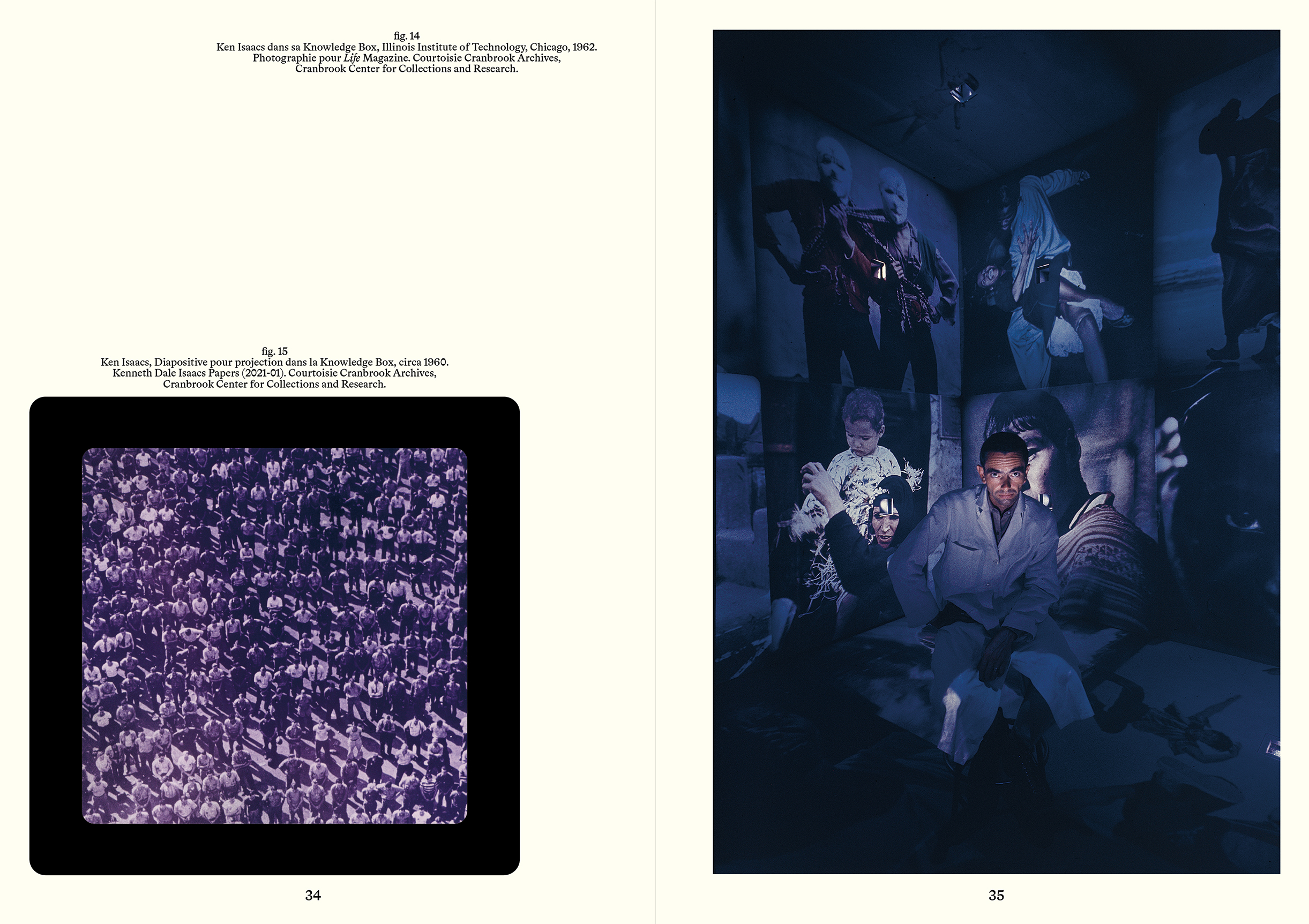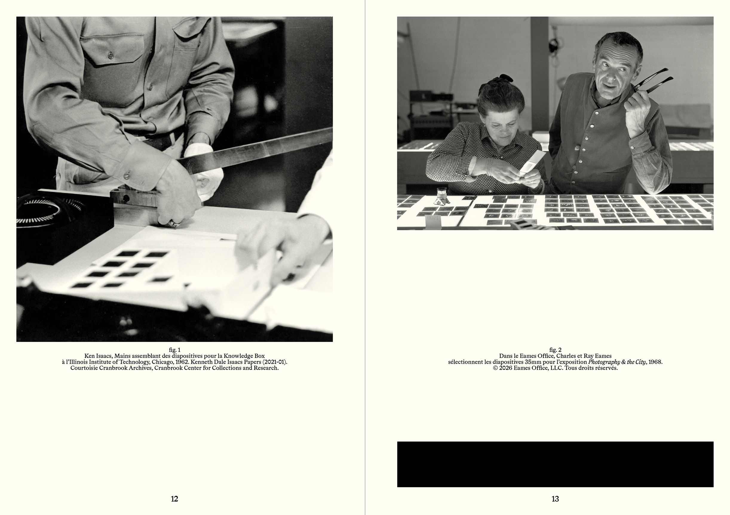 La puissance des images [The power of images] brings together Art X (1952) by Ray and Charles Eames, George Nelson and Alexander Girard with Ken Isaacs' Knowledge Box (1962), two revolutionary approaches to teaching art and design through images. Heirs to the immersive projection devices of the 19th century, which democratised knowledge on a large scale, these avalanches of experimental images short-circuit inductive reasoning and abolish the boundaries between disciplines and between the fields of knowledge and learning. Far from being case studies of the past, they attempt to counteract the loss of attention linked to the technological seductions of vision and their impact, a concern that we still experience today.