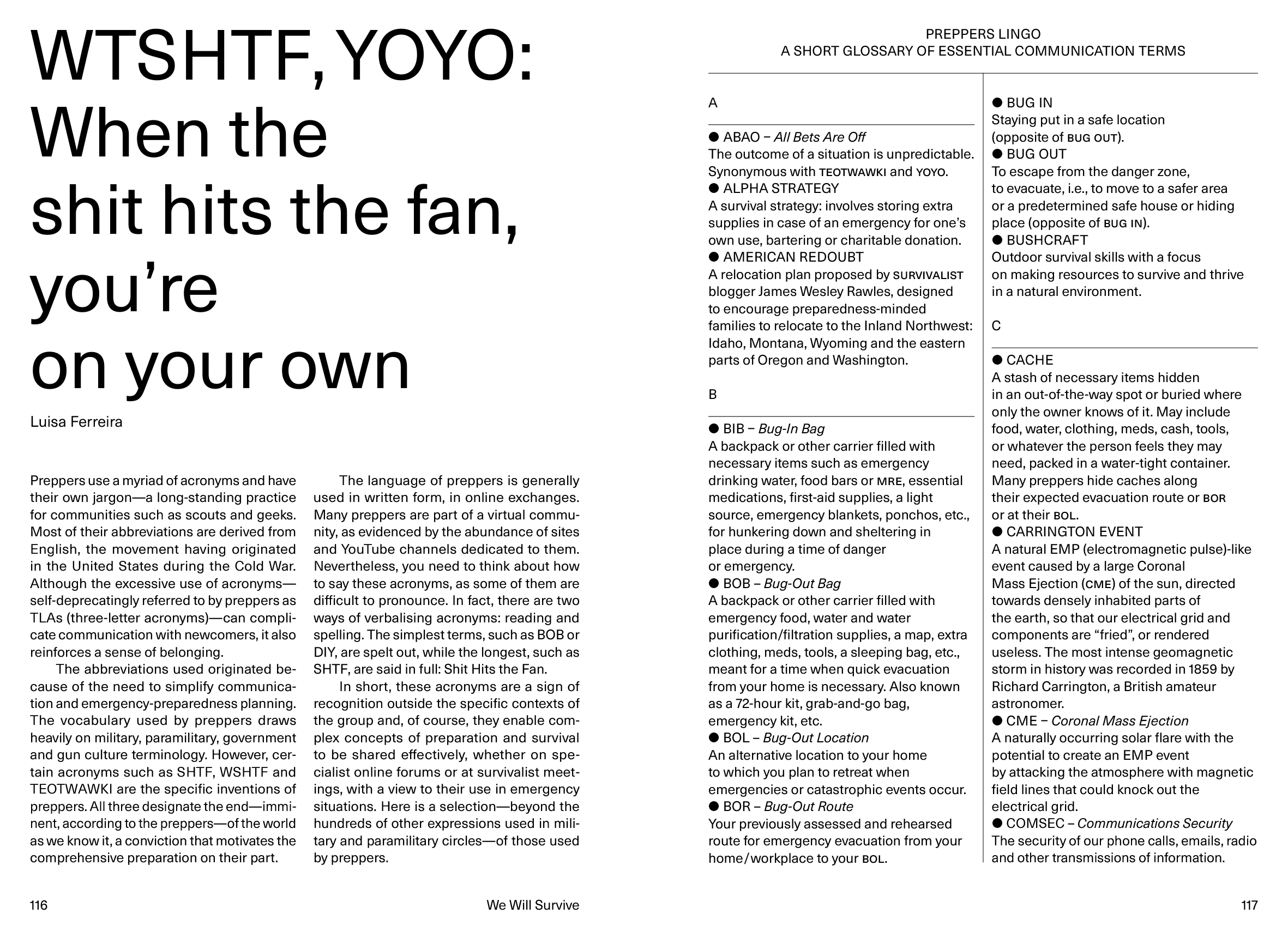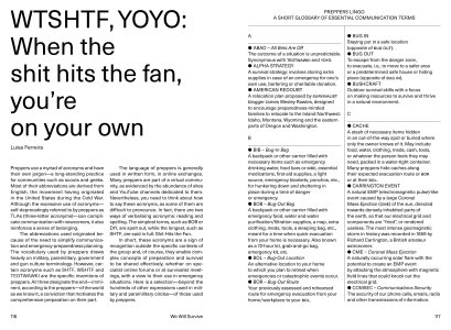 A collective reflection on the ability of objects and design to contribute to survival and protection against disasters, based on an examination of the phenomenon of “preppers”.