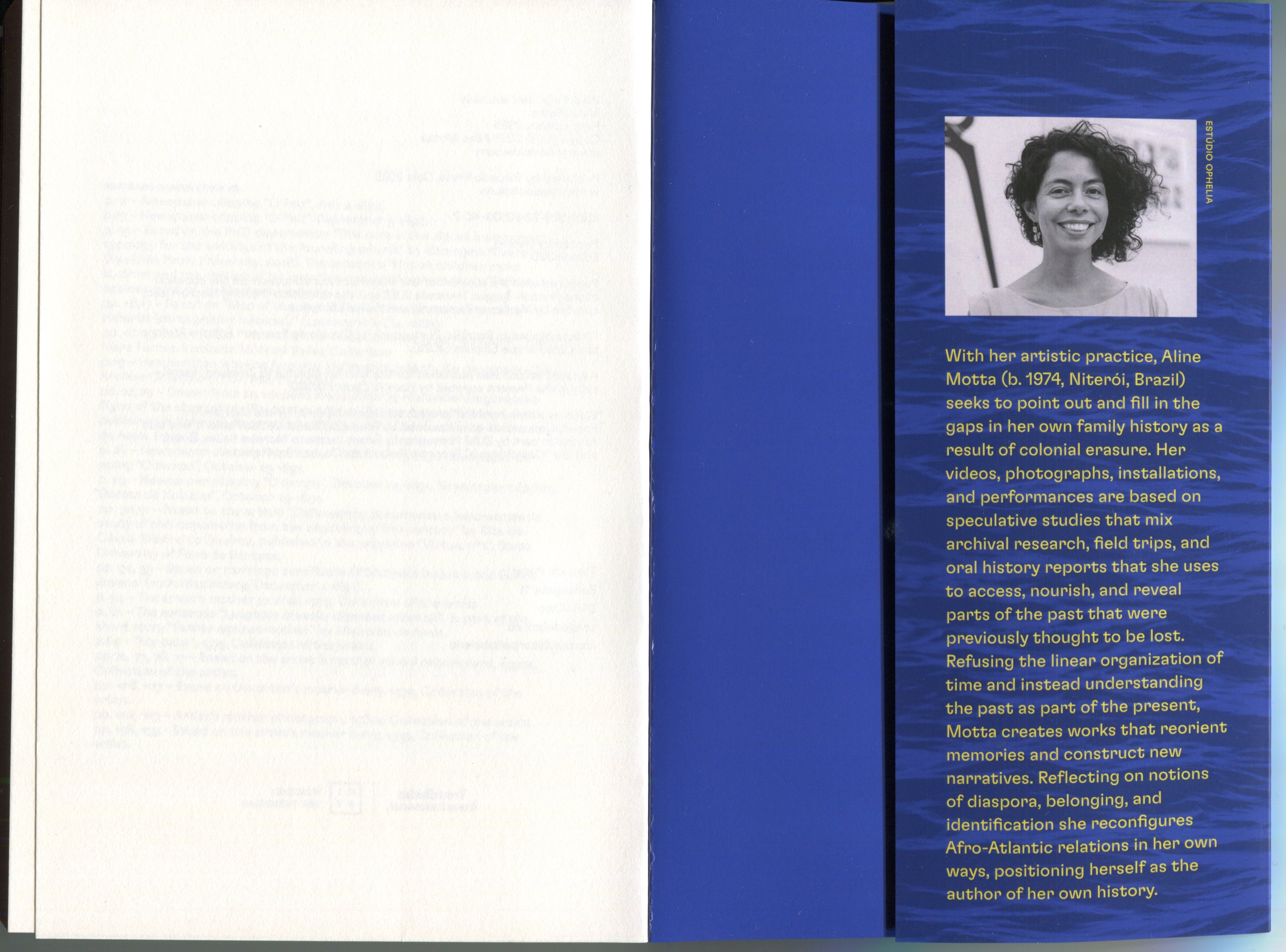 Aline Motta (born in 1974 in Niterói) is a Brazilian visual artist based in São Paulo. She uses photography, video, text, and performance to explore themes such as identity, memory, and family and historical heritage.