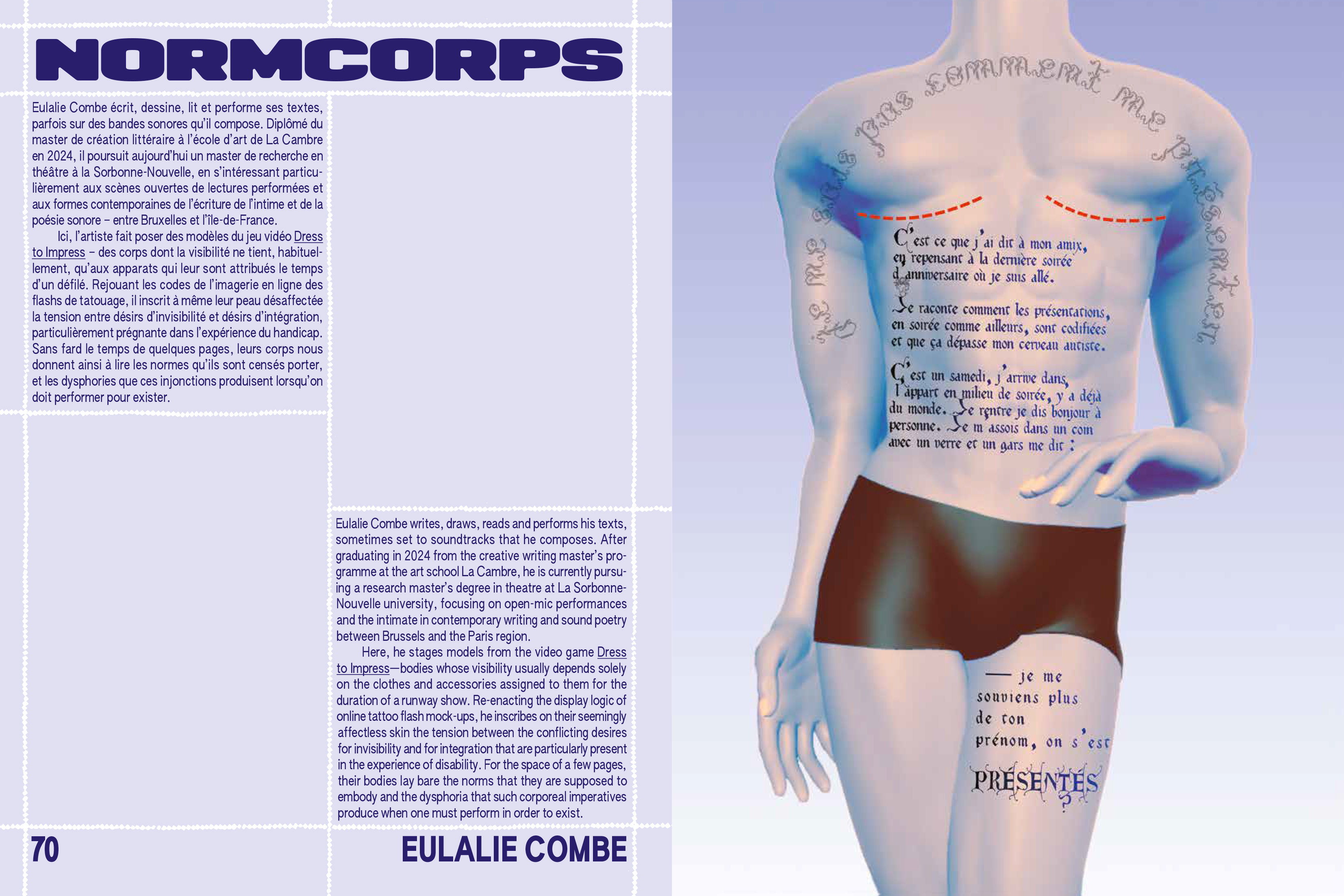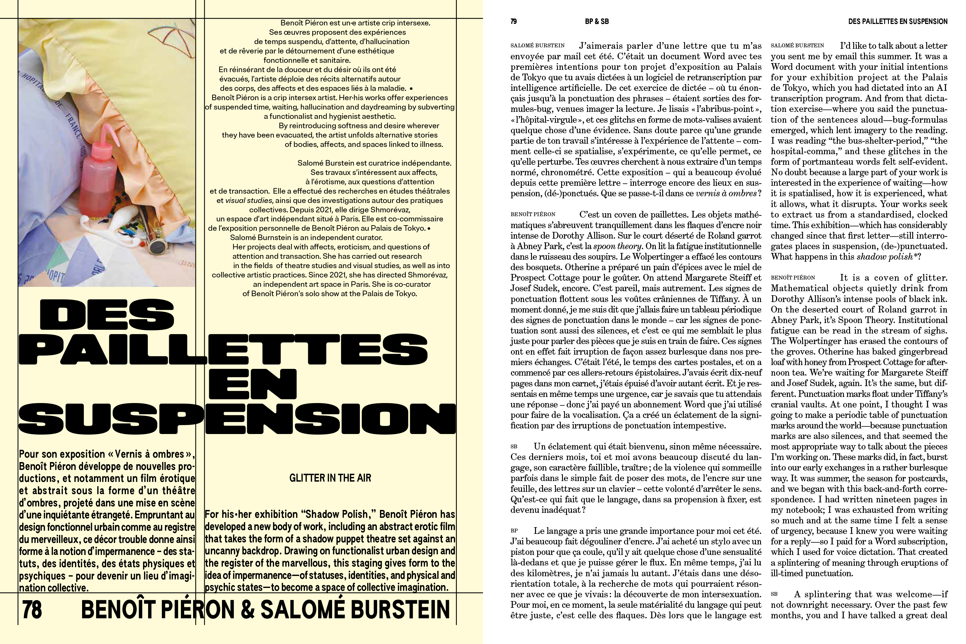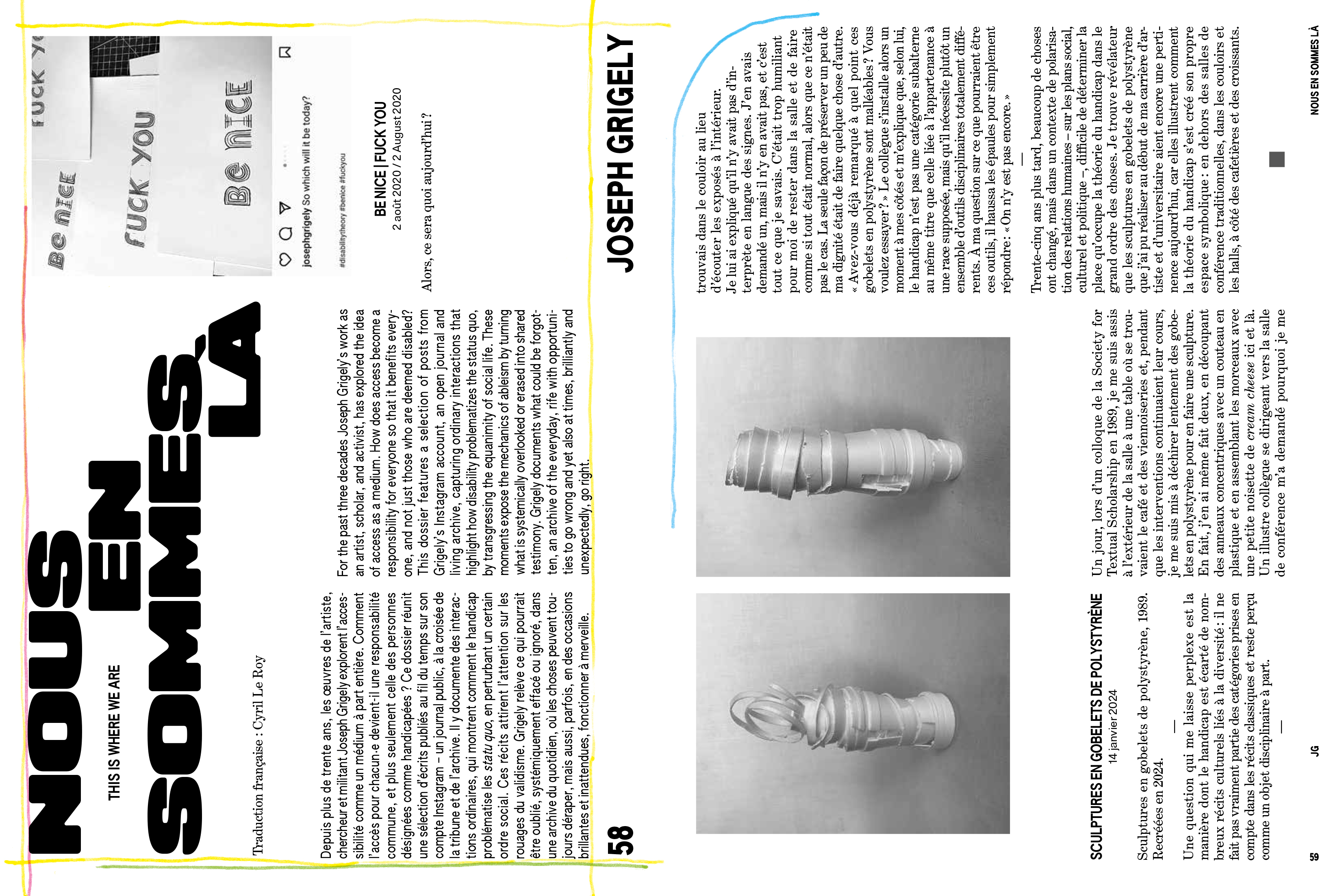 This issue is published on the occasion of a new season of exhibitions at the Palais de Tokyo (03.04 – 13.09 2026), in particular Joseph Grigely's solo show This Is Where We Are, Benoît Piéron's solo show Shadow Polish, as well as the group show Cheryl Marie Wade, the Queen-Mother of Gnarly,curated by Lucie Camous and Étienne Chosson, based on an unfinished documentary by Diane Maroger (with: Panteha Abareshi, John Lee Clark, Tarik Dobbs, Noa Micaela Fields, Joseph Grigely, Carolyn Lazard, Diane Maroger, Park McArthur, Saleem Hue Penny).