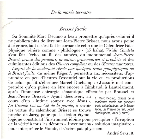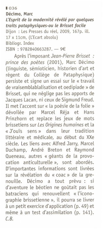 Duchamp, Breton...), its relationship with futurism, pataphysics, surrealism, dada, etc., its sources and its offspring in the fields of literature, linguistics, psychoanalysis, science, philosophy and art.