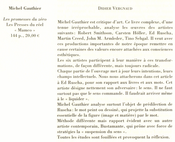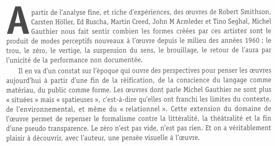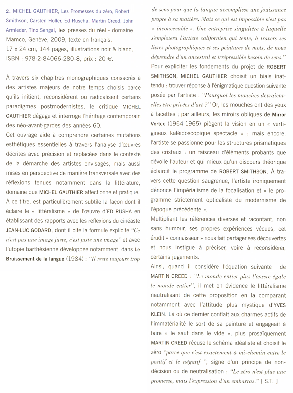 Robert Smithson, Carsten Höller, Ed Ruscha, Martin Creed, John M Armleder, Tino Sehgal