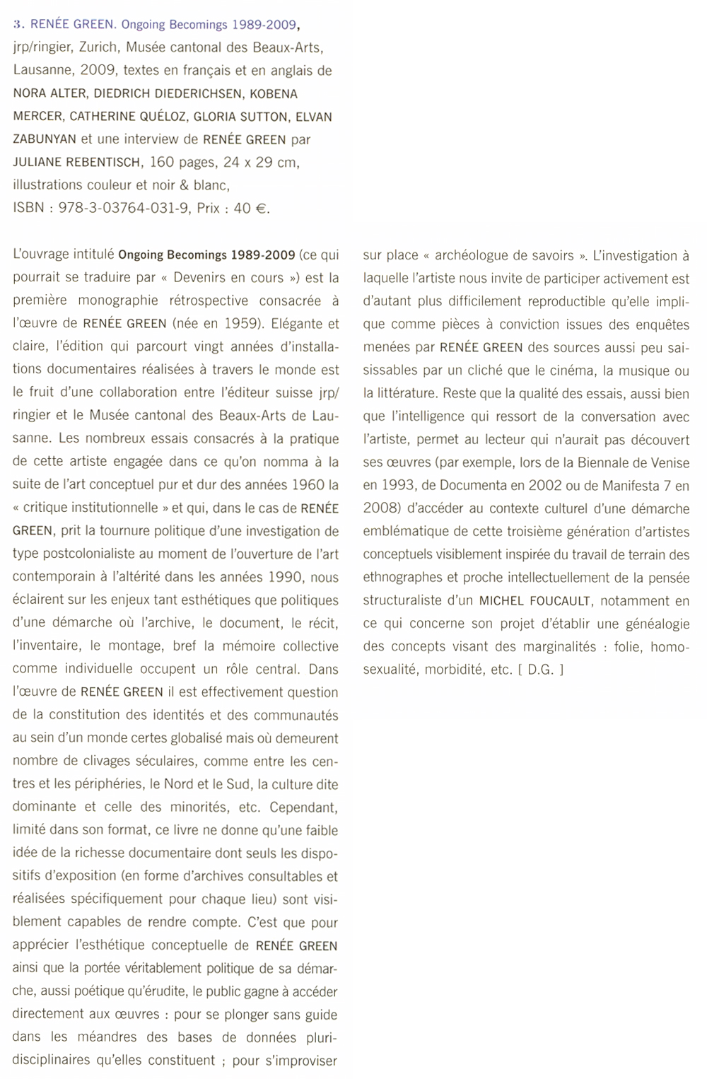 The essays by Nora Alter, Diedrich Diedrichsen, Kobena Mercer, Catherine Quéloz, Gloria Sutton, Elvan Zabunyan, and the interview between Julian Renbentisch and Renée Green not only give an historical overview of the artist's work, but engage with issues central to her practice such as questions of genealogy and memory, archives and their reworkings, movements and displacements, site-specificity and location, positionalities and perceptions. They offer new insight into the artist's specific use of images, sound and text, and her inscription in art history.