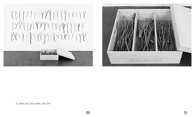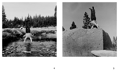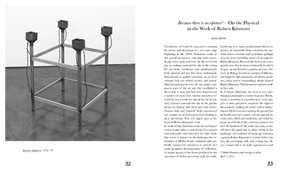 Robert Kinmont (born 1937 in Los Angeles) is primarily concerned with his environment, the Californian landscape. He works with simple, mostly natural materials, and places them in relation to his body and his life. Probably his best known work, entitled 8 Natural Handstands (1969/2005), a series of photographs showing the artist doing handstands in abandoned landscapes, on the edges of cliffs, river beds, forests and deserts, was illustrated in Lucy Lippard's famous book Six Years: The Dematerialization of the Art Object from 1966 to 1972. Not so long afterwards, Kinmont retreated from art practice for the following three decades.