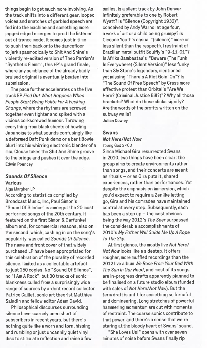 Crass, Ciccone Youth, Afrika Bambaataa, Yves Klein, etc. In their own quiet way, these silences speak volumes: they are performative, political, critical, abstract, poetic, cynical, technical, absurd… They can be intended as a memorial or a joke, a special offer, or something entirely undefined. The carefully chosen silences of this anthology are intrinsically linked to the medium of reproduction itself and reveal it's nude materiality. They expose their medium in all its facets and imperfections, including the effect of time and wear. At the most basic level, these silences are surfaces. And it is in their materiality that they distinguish themselves from the conceptual experiments of