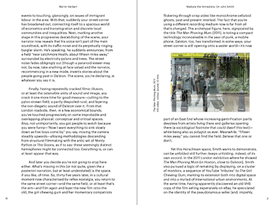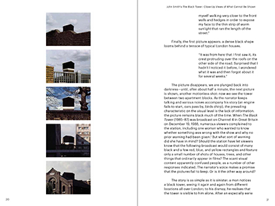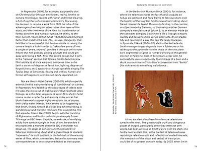 Herbert's text provides an incisive overview of Smith's work over the past four decades while Christie examines Smith's oeuvre within the context of English eccentricity. Meyer's essay discusses Smith's film The Black Tower in relation to absence and abstraction while de Seife looks at cinematic scale through the prism of Smith's Gargantuan.
