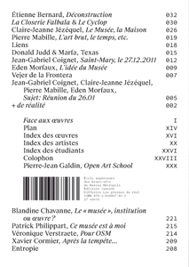 “Open Sky Museum” is an artistic proposal to “face up to the works” in an open air museum, out of the city. The works are given up to the spectators' gaze, without mediation, conservation or caretaking, at the mercy of time and weather.This catalog recount, backwards, the museum's history, from its conception until its destruction by a storm in December 2013. It contains many photographs, testimonies of guest artists, plans of the museum, emails exchanges...