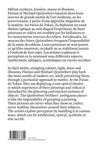 In their works, mingling colours, light, mass and illusions, Florian and Michael Quistrebert play back the main motifs of modern art, while perverting them, through a particular approach to matter. At the Palais de Tokyo, they are deploying a vast optical theatre in which experience of their paintings and videos is disturbed by the glittering and internal motions of objects. The Quistrebert brothers' ambiguous pieces evoke the impossibility of grasping a painting. Their pictures are never what they show or, rather, never stabilize themselves around their subjects. The artists explore perception by handling it in various ways, which can be intellectual, optical, symbolic or else occult.