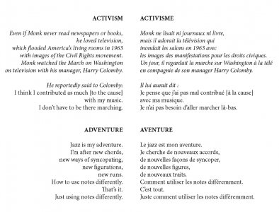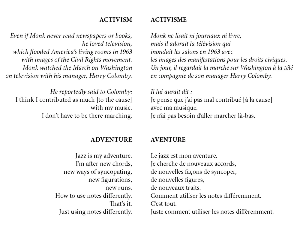 A collection of quotations from Thelonious Monk, organized as an alphabet book. More than a hundred entries based on the testimonies of musicians (Steve Lacy, Sahib Shihab, Henri Renaud) and journalists (Leonard Feather, Ira Gitler, Val Wilmer…).