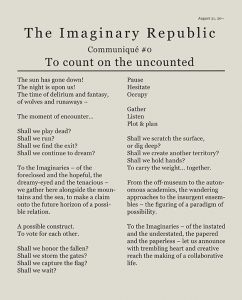 This recording stems from a collaborative sound experimentation developed as part of a project to create new forms for artistic research within the university. Invited artists, musicians, and researchers produced a series of sound actions focusing on questions of community, creative resistances, sonic agency and the créolité passing between Haiti and Quebec.