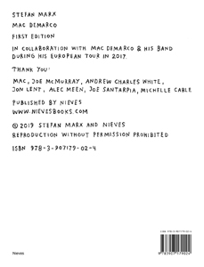 During Mac DeMarco's European Tour in the fall 2017 Stefan Marx joined the band for a few stops to draw on stage during Mac DeMarco's live performance. Hiding in the back of the band, he got time to capture a unique view on the five musicians, the whole performance, some behind the scenes moments and the audience. This artist book contains most of the drawings from these concerts and is compiled by Stefan Marx, it is his 26th publication with Nieves.