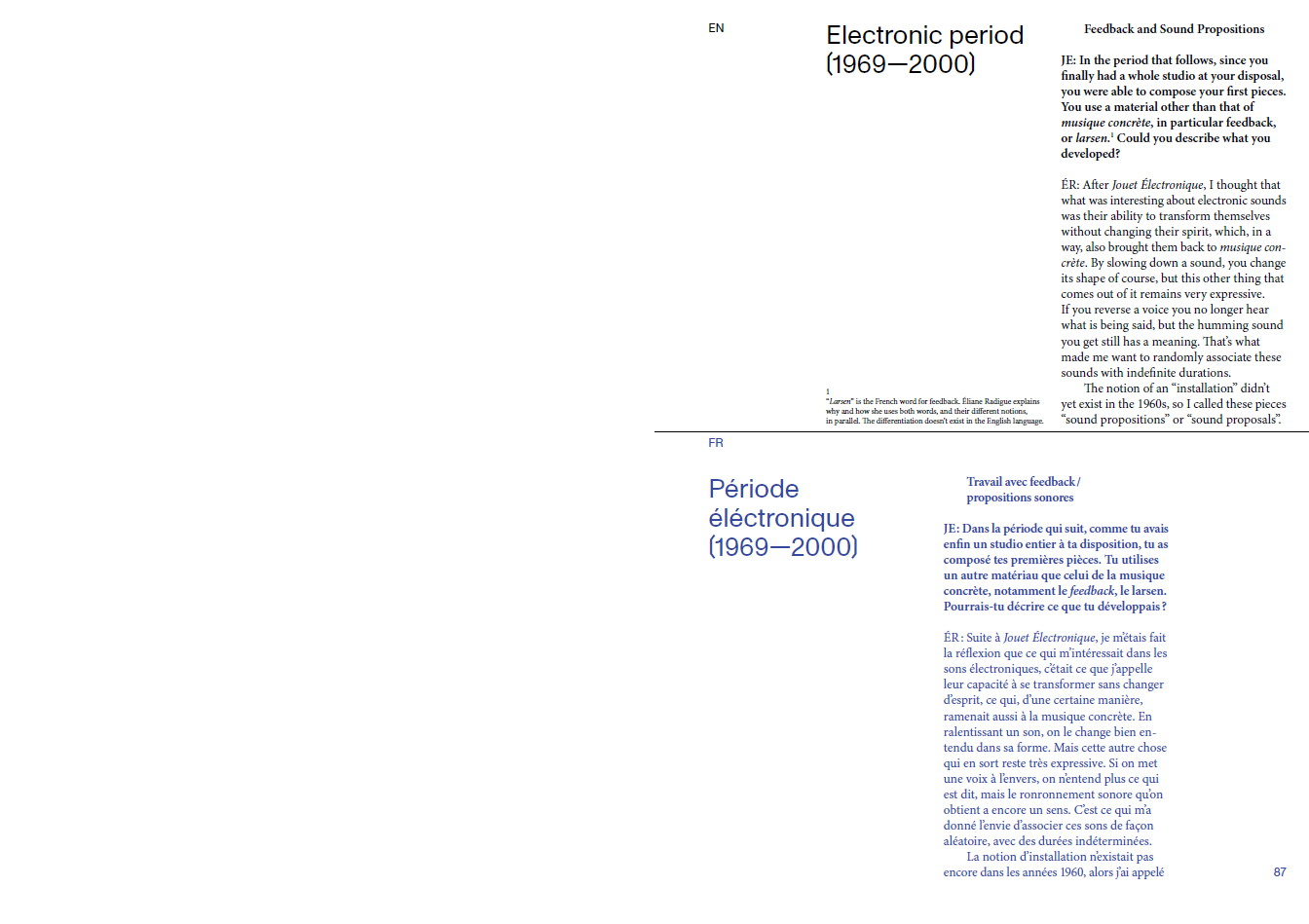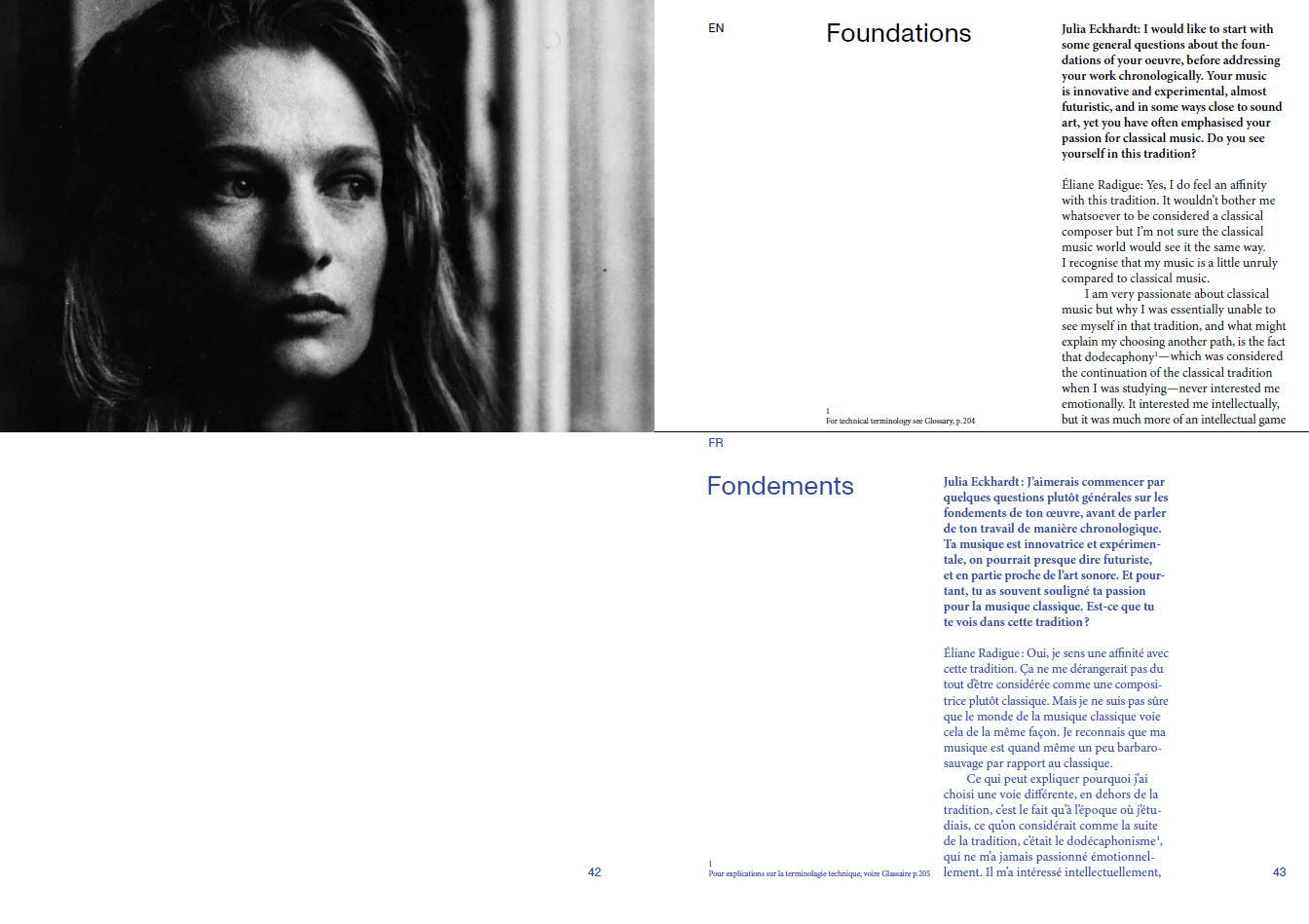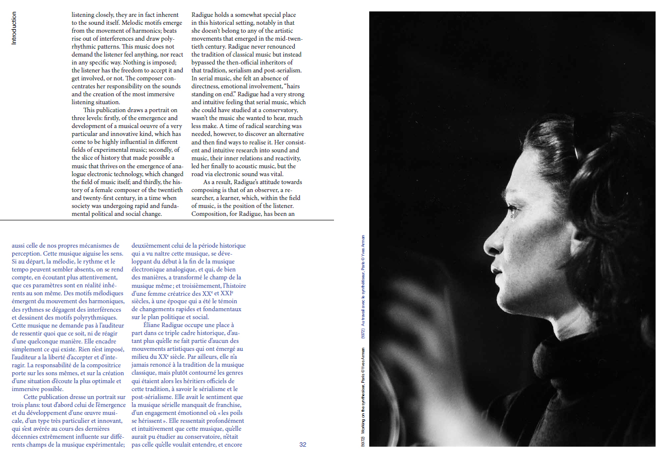 In the long interview that forms the body of this publication, Éliane Radigue talks about her work, her reflections and underlying research, as well as her historical context. The publication also contains a commented list of works and Radigue's programmatic text on The Mysterious Power of the Infinitesimal.