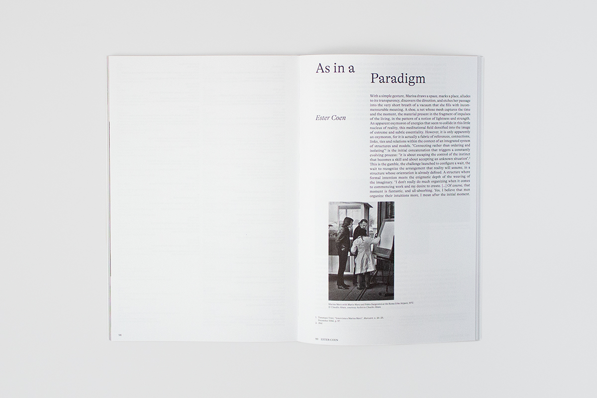“With a simple gestures, Marisa draws a space, marks a place, alludes to its transparency, discovers the direction, and etches her passage into the very short breath of a vacuum that she fills with incommensurable meaning. A shoe, a net whose mesh captures the time and the moment, the material present in the fragment of impulses of the living, in the pattern of a notion of lightness and strenght.”—Ester Coen