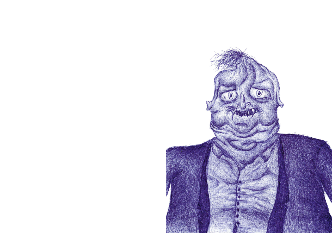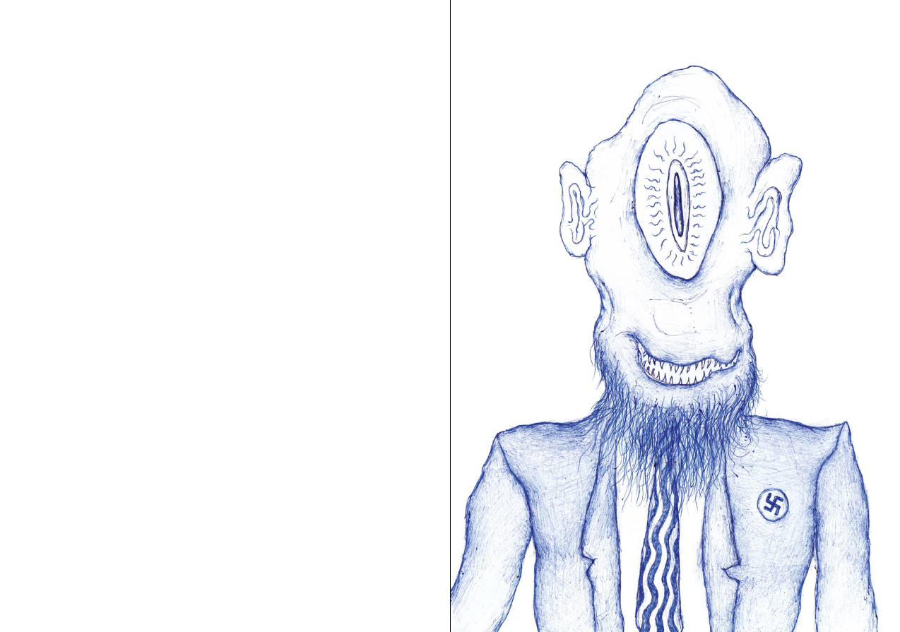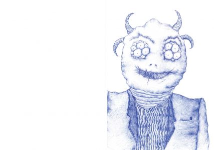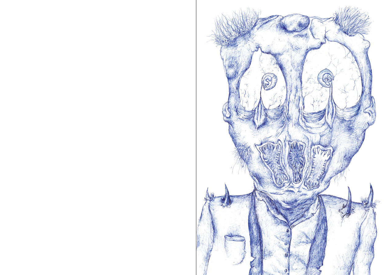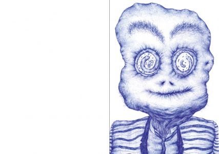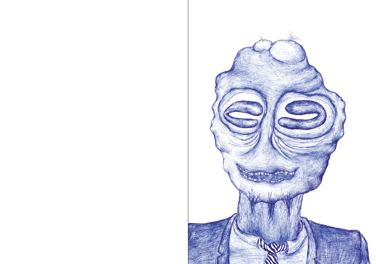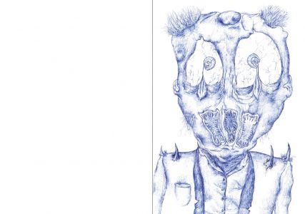 Monsters in Suits neatly lines up this whole cabinet of horrors in a series of mock-official busts. The bigshots of politics and business are captured and caricatured here in dark blue ballpoint. But these aren't straightforward portraits of Nestlé's CEO (“Water is not a human right”), the head of the Ku Klux Klan or the ringleaders of far-right youth groups. They are distorted and mixed up by the subconscious into grotesque monsters and bogeymen, each fitted out with the trappings of respectability: namely a suit and tie. They're ready for business—whatever the cost to the welfare of the world. Here, for once, they show their true colors—and their true mugs.