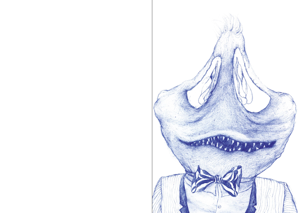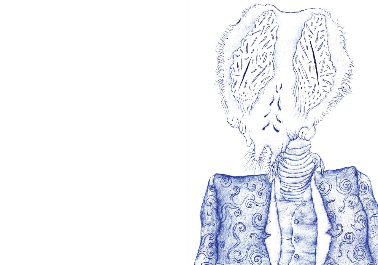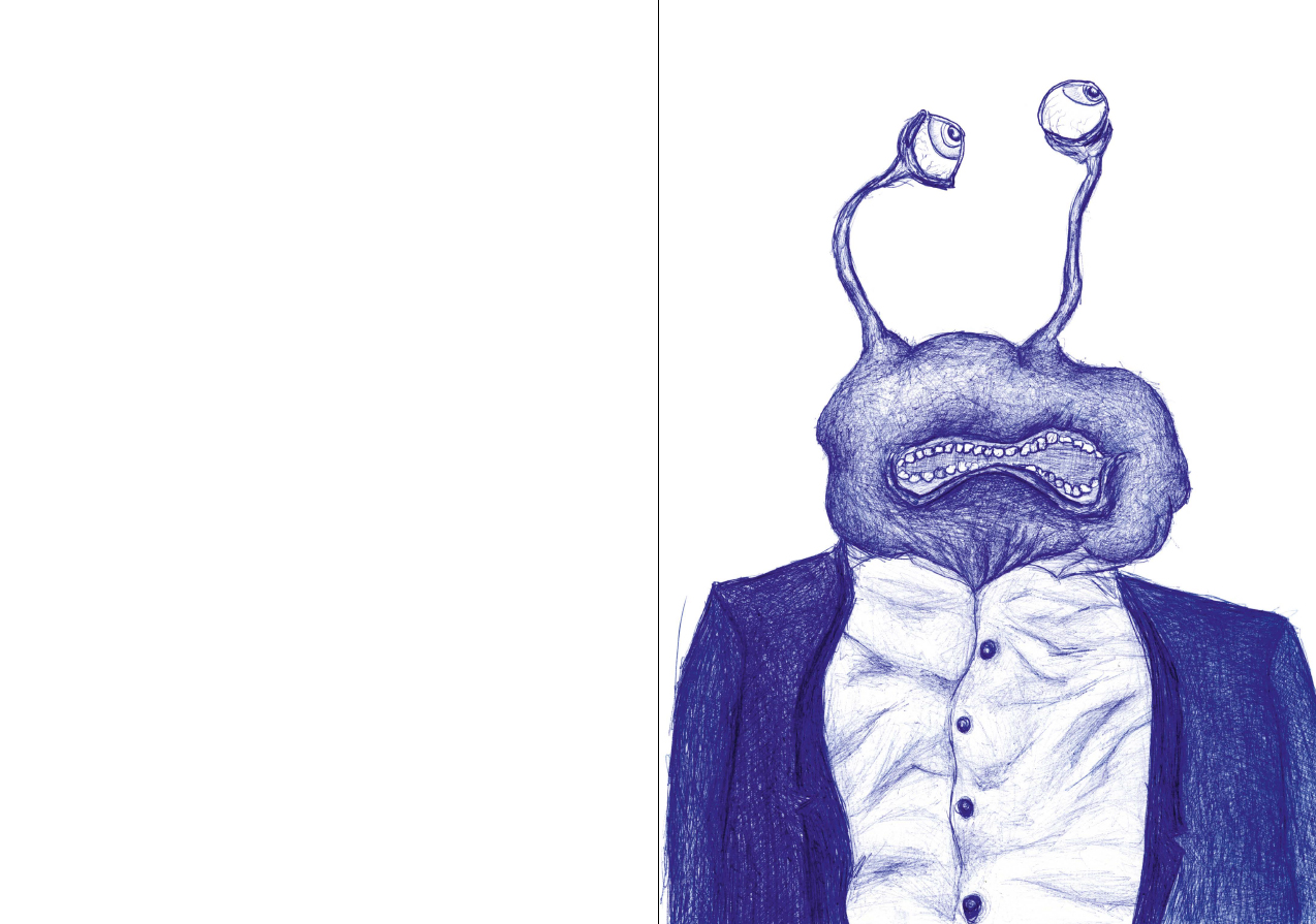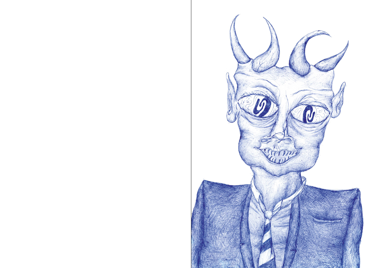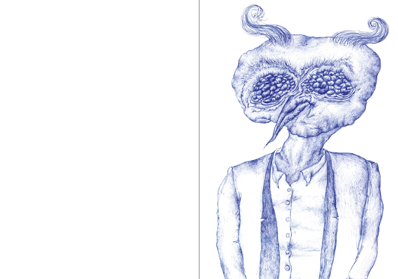 Monsters in Suits neatly lines up this whole cabinet of horrors in a series of mock-official busts. The bigshots of politics and business are captured and caricatured here in dark blue ballpoint. But these aren't straightforward portraits of Nestlé's CEO (“Water is not a human right”), the head of the Ku Klux Klan or the ringleaders of far-right youth groups. They are distorted and mixed up by the subconscious into grotesque monsters and bogeymen, each fitted out with the trappings of respectability: namely a suit and tie. They're ready for business—whatever the cost to the welfare of the world. Here, for once, they show their true colors—and their true mugs.