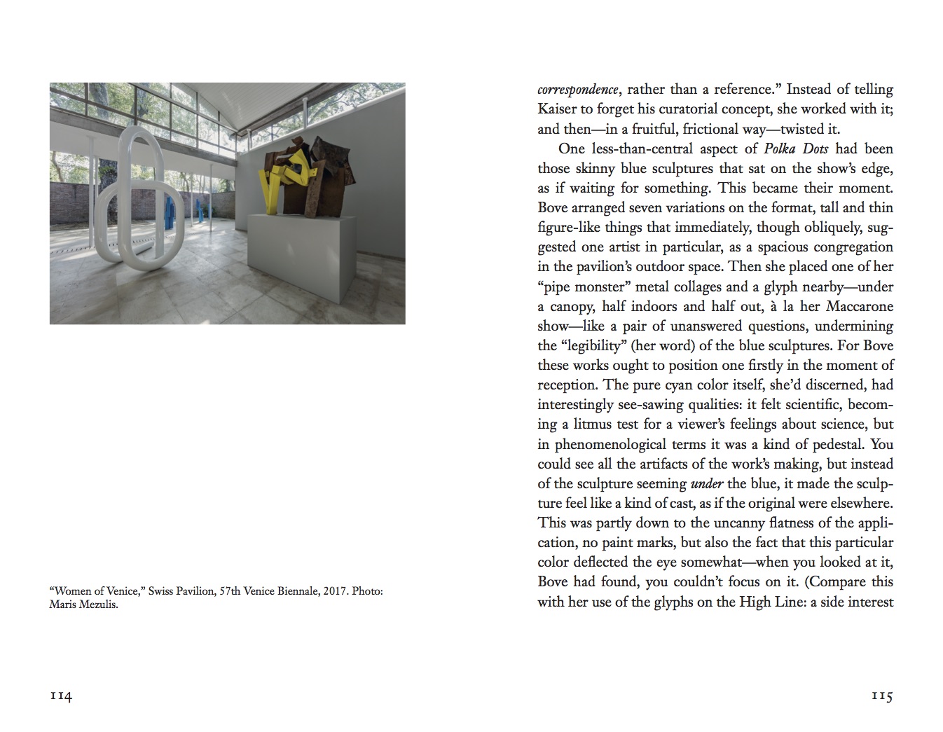 The artist's large-scale sculptures are often exhibited outdoors and in public spaces. Bove debuted her largest sculpture to date at the 2018 edition of “Unlimited” at Art Basel. In 2017, the artist's sculptures were installed in the Betty and Edward Marcus Sculpture Park at Laguna Gloria, The Contemporary Austin. That same year, her work was on view in “Women of Venice” at the Swiss Pavilion at the 57th Venice Biennale, where she was invited to respond to the legacy of Swiss artist Alberto Giacometti. Bove's steel-beam sculpture Lingam (2015) was installed in City Hall Park in New York as part of the 2016 group exhibition, “The Language of Things”, organized by Public Art Fund. In 2013, she created a series of sculptures for the High Line at the Rail Yards in New York.