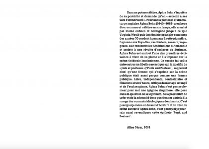 A writing project around the English poet and playwright Aphra Behn (1640-1689), an avant-garde feminist and protest figure who was one of the first writers to make a living from her pen and establish herself on the London theater scene.