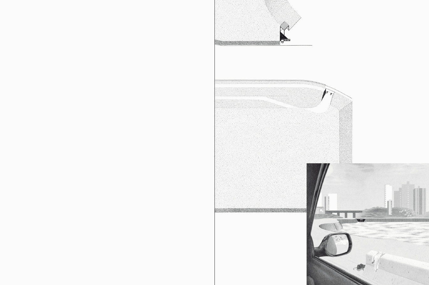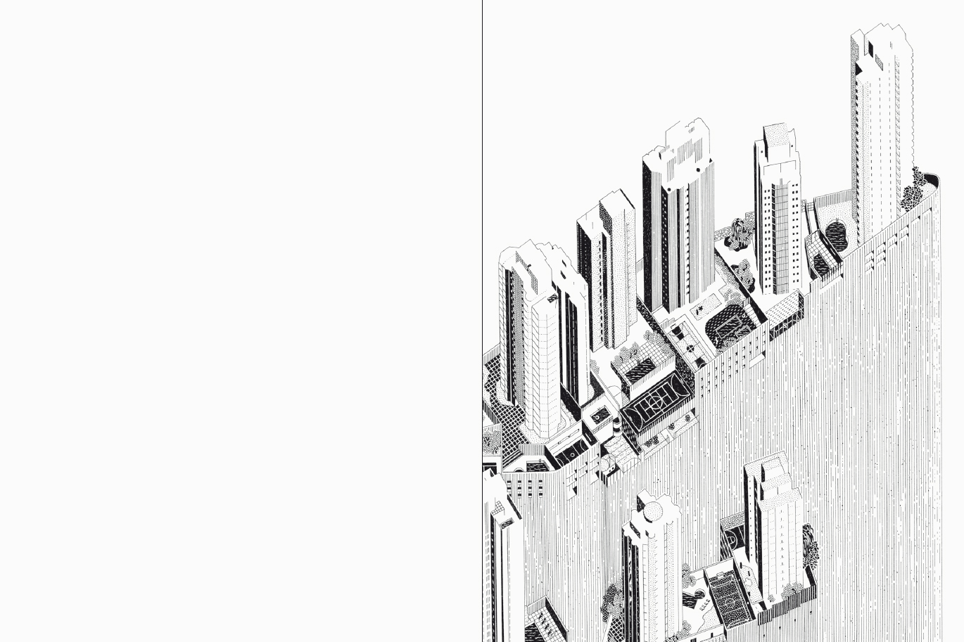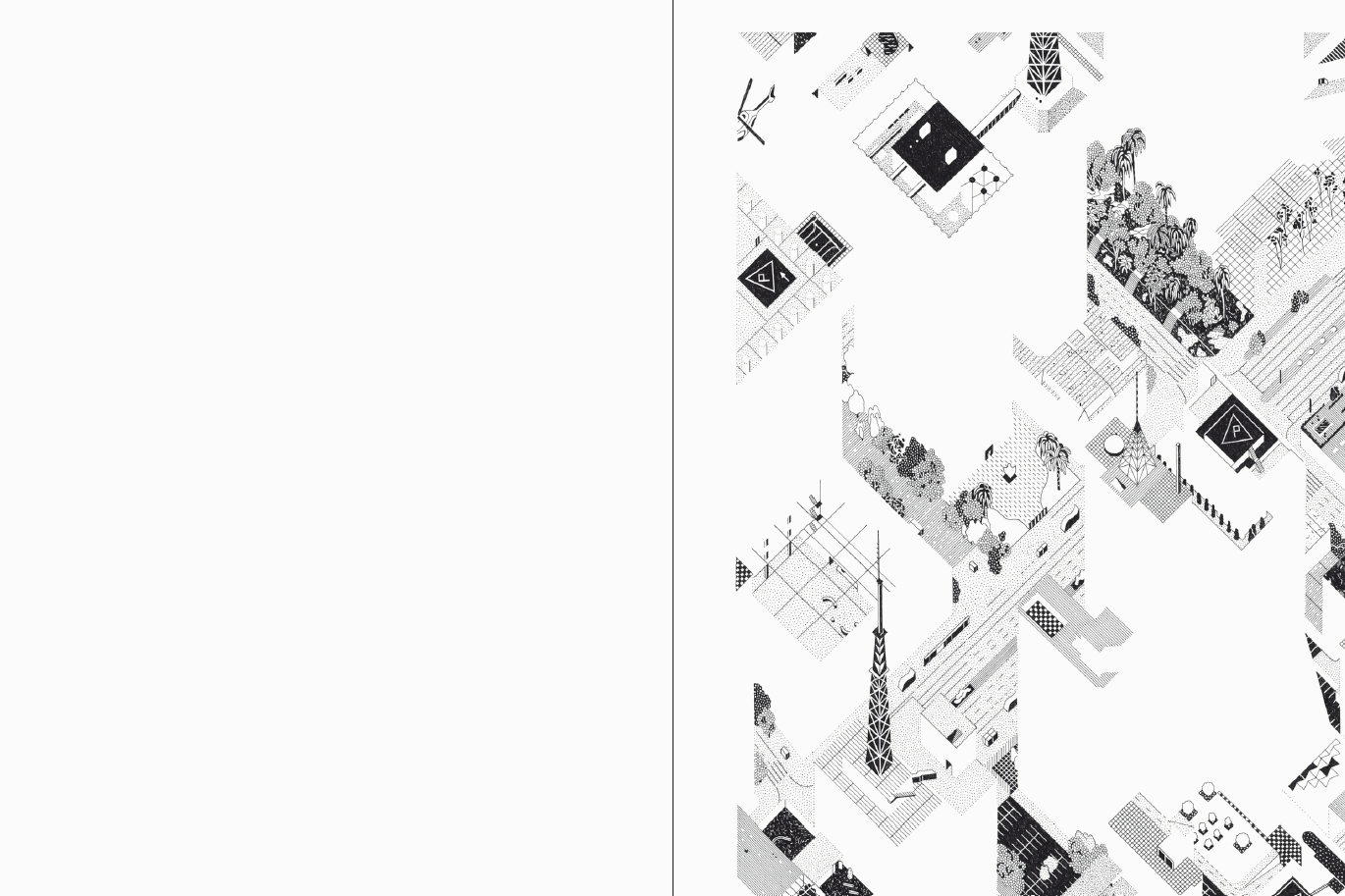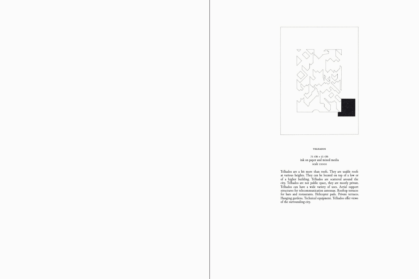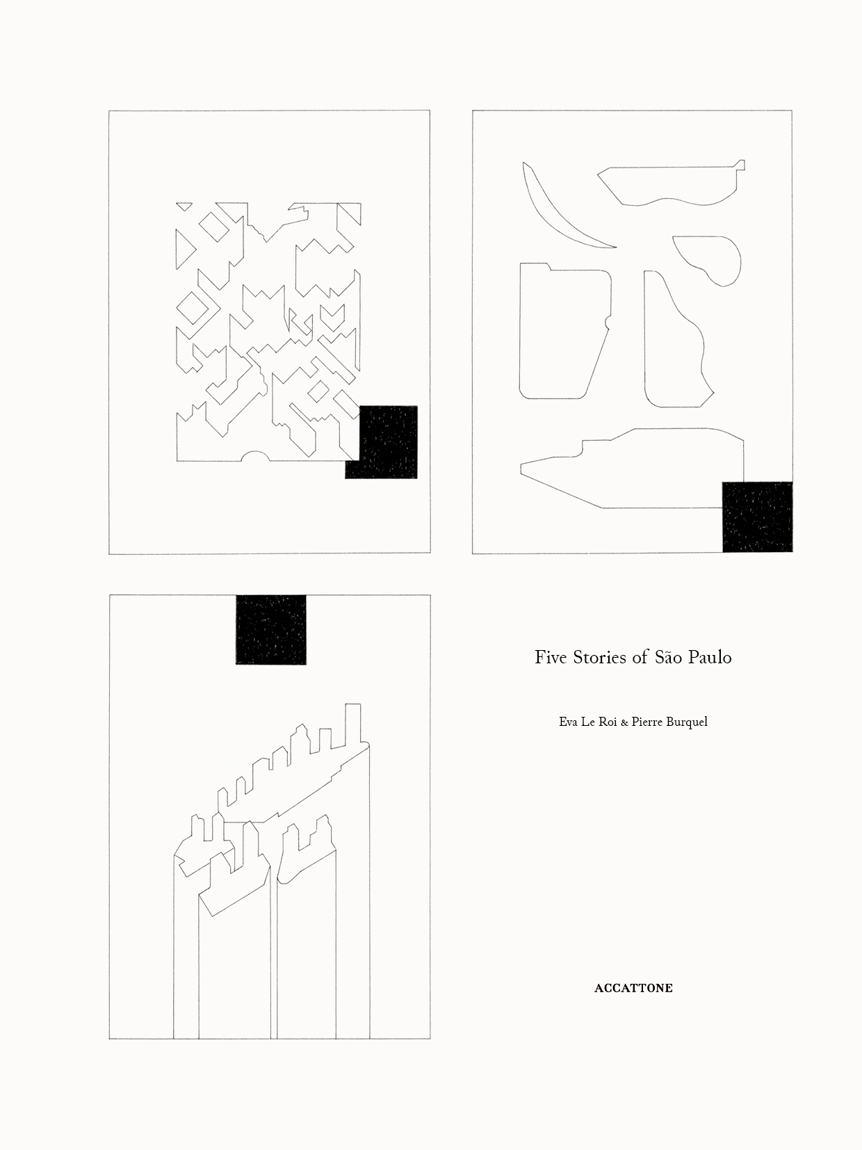In summer 2019, artist Éva Le Roi and architect Pierre Burquel travelled to São Paulo to research its particular urban conditions, in conjunction with the exhibition TODO DIA / EVERYDAY, 12th Bienal de Arquitetura de São Paulo. Five urban situation have been selected and interpreted through a subjective axonometric drawing on a 1:1000 scale alongside a projection of its daily use: Telhados, Piscinões, Condomínios, Campos and Galerias. Éva Le Roi's hand drawings are reproduced in the book at their original scale.