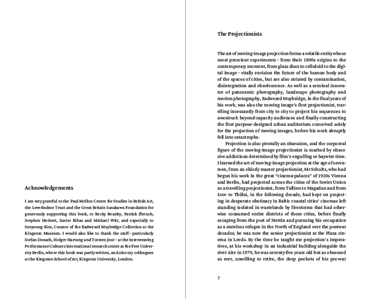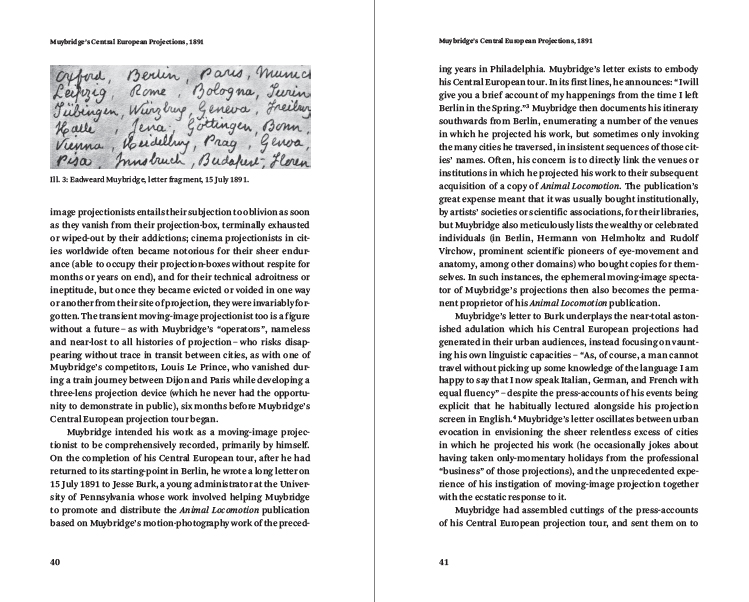 The book investigates contemporary urban projections as aberrant manifestations derived from Muybridge's first conjurations of projection's power for its spectators. Throughout, the book interrogates the strange figure of the projectionist, embodied first of all by Muybridge himself.