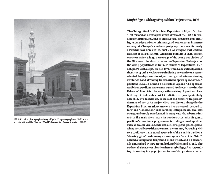 Eadweard Muybridge is among the seminal originators of the contemporary world's visual form, with its concentrated image-sequences of bodies in movement and its ocular obsessions. This book examines an almost unknown dimension of Muybridge's work, as a moving-image projectionist, who toured Europe's cities to enthral beyond-capacity audiences with unprecedented projections and who built a moving-image auditorium—long before cinemas were created—in which to project his work at the 1893 Chicago World's Columbian Exposition. That final invention of Muybridge's was both an all-engulfing catastrophe and the vital precursor for the following century's worldwide manias for projection. Based on entirely new research into Muybridge's travels, audiences, auditoria and projectors, this book explores his initiating role in moving-image projection and also maps Muybridge's driving inspiration for subsequent artists and filmmakers preoccupied with the volatile entity of projection, from 1890s Berlin to contemporary Japan, via further spectacular World's Exposition events and cinemas' overheated projection-boxes.