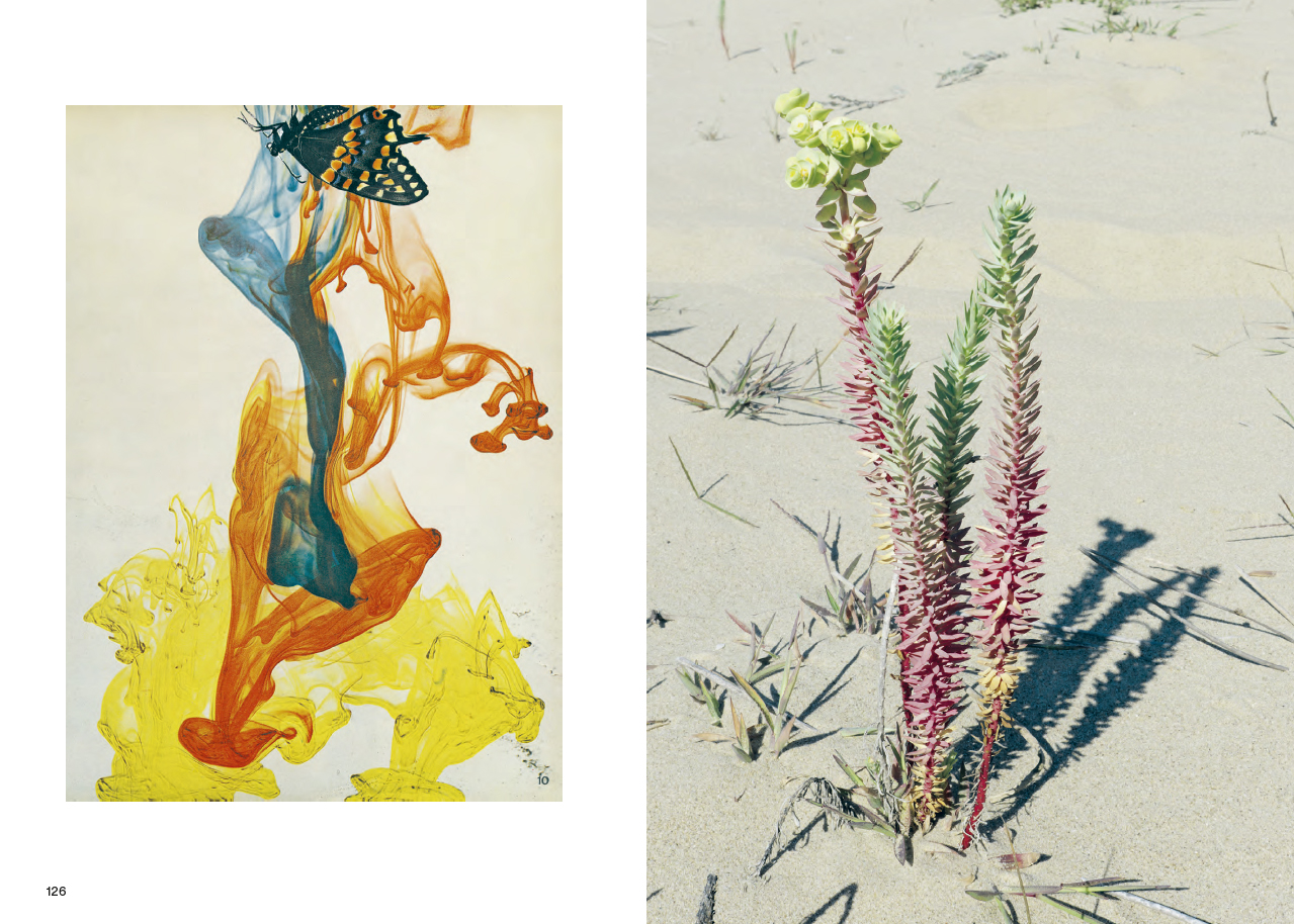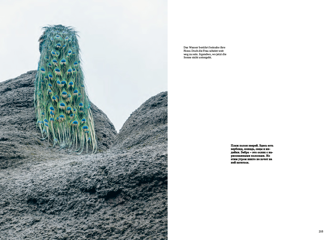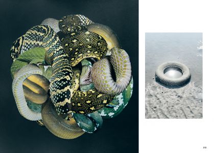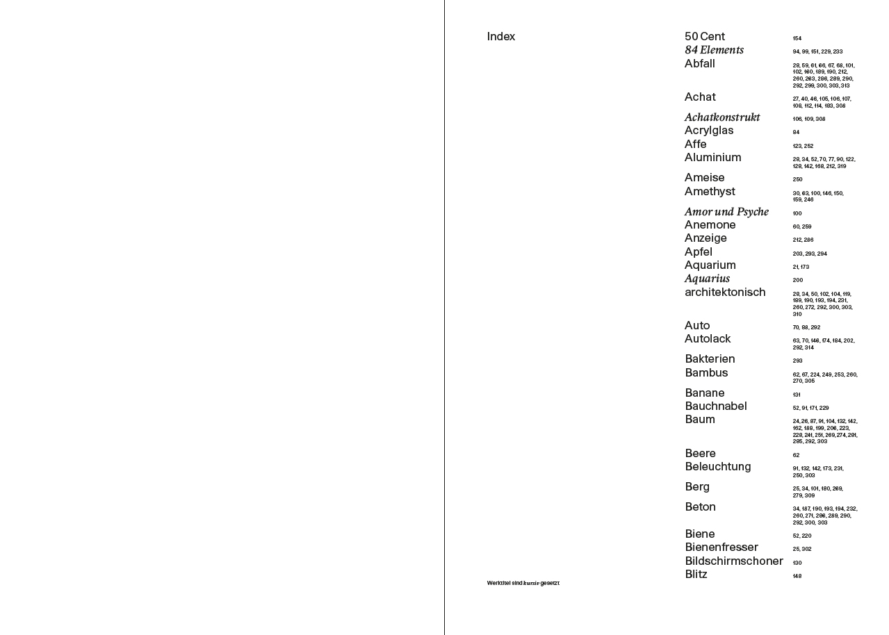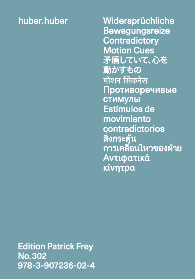 Widersprüchliche Bewegungsreize picks up where the author's previous book, Universen (Edition Patrick Frey, 2011), left off and gives visible, palpable form to their artistic work over the past ten years, transporting the reader once again into a teeming pictorial cosmos. In contrast to Universen, however, this artist's book features huber.huber's photographs rather than collages and ink drawings. Presented in two-page spreads, the pictorial compositions form ascending and descending series of various lengths in which other images using other techniques are embedded. The upshot is a dazzling tapestry of images, producing a sort of visual dissonance which, in extreme cases, is liable to cause the same symptoms as motion sickness. Brief texts (translated into a total of seven different languages), ranging from succinct descriptions to associative sensory impressions, provide clues to some of the compositions and sequencing whilst also serving as agreeable interludes. A remarkably comprehensive index of nouns (e.g. “apple”, “petri dish”, “salt lake”) and adjectives (e.g. “moist”, “geometric”, “eerie”) helps to render the artists' enigmatic visual cosmos readable.