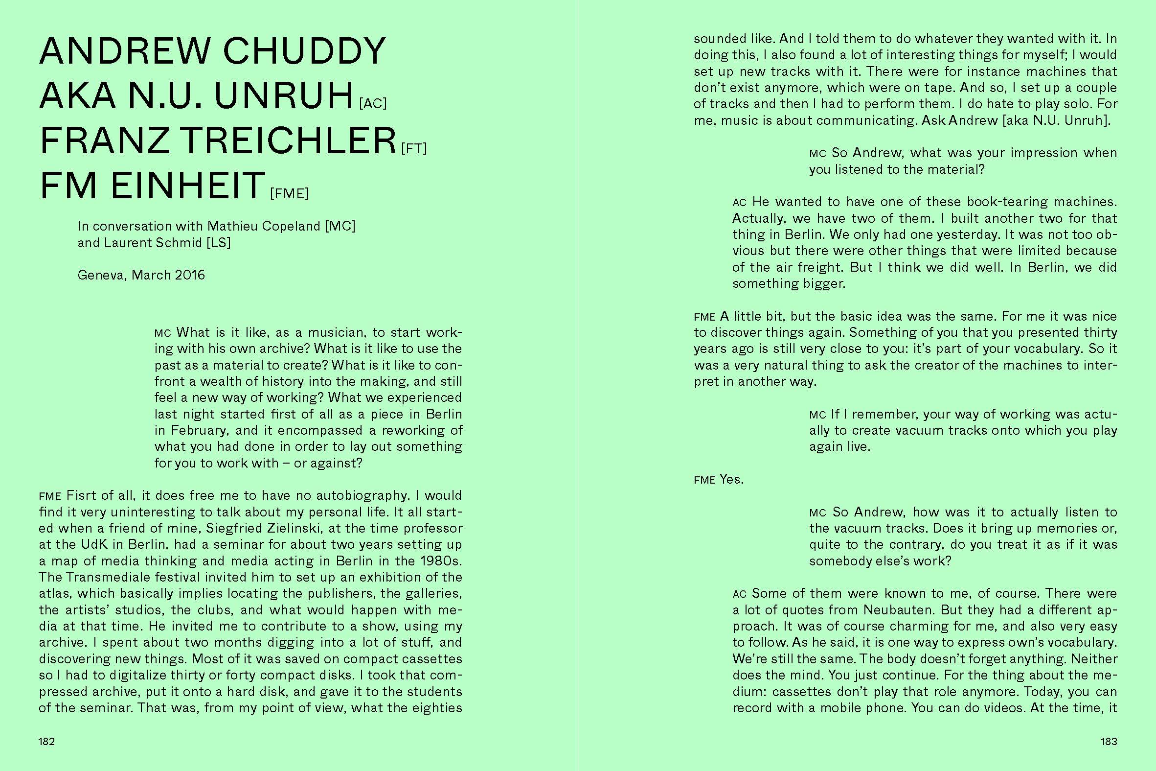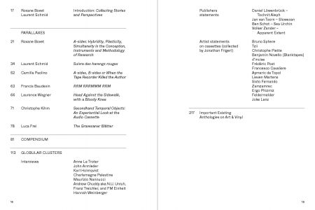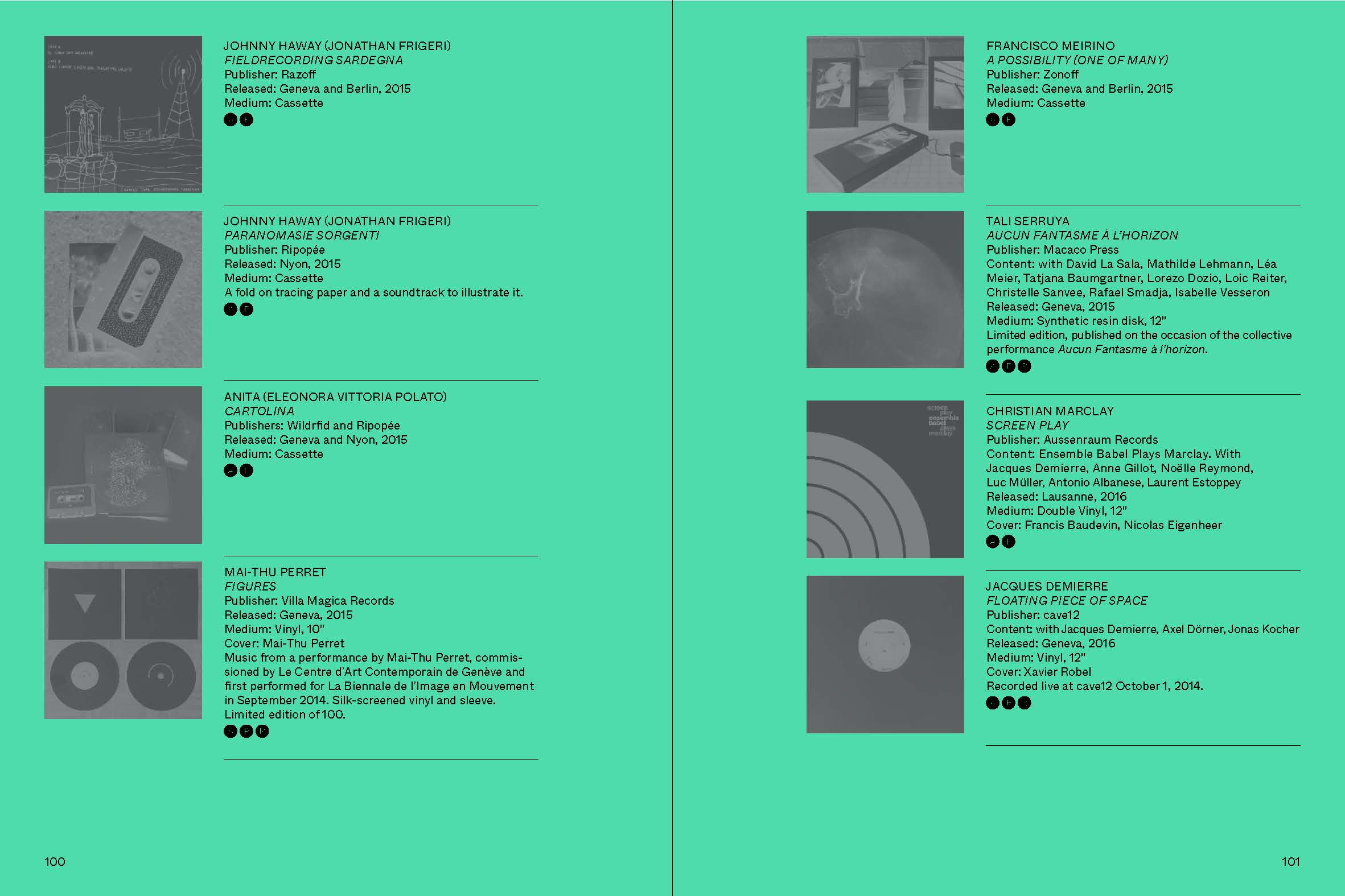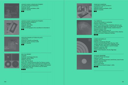 Contributions by Laurent Schmid, Roxane Bovet, Camilla Paolino, Francis Baudevin, Laurence Wagner, Christophe Kihm, Luca Frei, Anne Le Troter, John Armleder, Karl Holmqvist, Charlemagne Palestine, Maurizio Nannucci, Mathieu Copeland, N.U. Unruh, Franz Treichler, FM Einheit, Hannah Weinberger, Daniel Löwenbrück, Jan van Toorn, Ben Schot, Volker Zander, Bruno Sphere, Tzii, Christophe Piette, Benjamin Novello (Blanktapes), d'incise, Frédéric Post, Francesco Cavaliere, Aymeric de Topol, Lieven Martens, Sixto Fernando, Zamzamrec, Ergo Phizmiz, Feldermelder, Joke Lanz, Jonathan Frigeri.