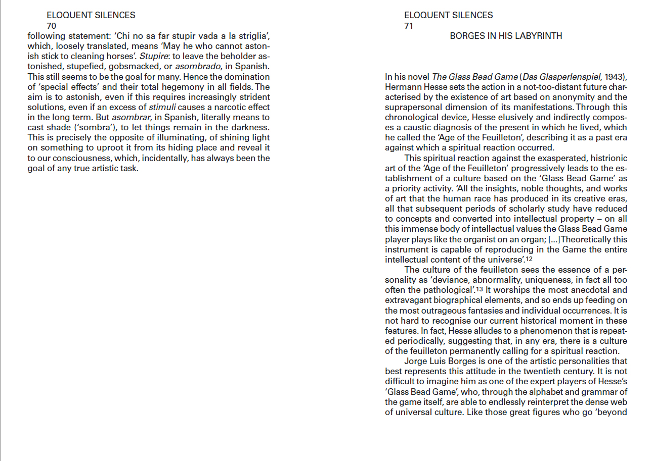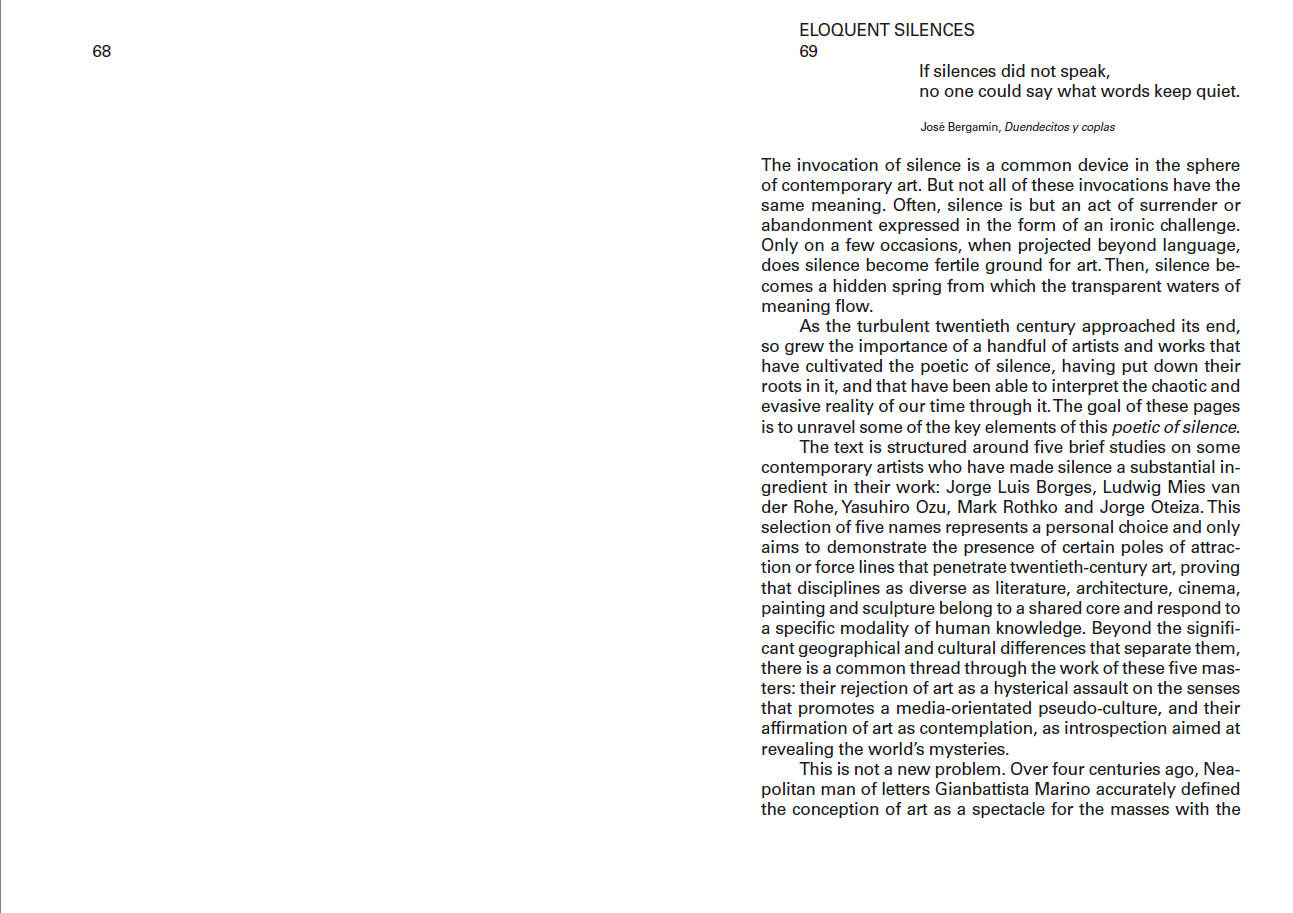 Jorge Luis Borges, Ludwig Mies van der Rohe, Yasushiro Ozu, Mark Rothko, Jorge Oteiza - a writer, an architect, a filmmaker, a painter, a sculptor. Five personalities of the 20th century separated by their mediums, their subjects of investigation and their disciplines. They are brought together in this book by the need to save art from its current alteration, and to bring it back to a more contemplative and introspective dimension.