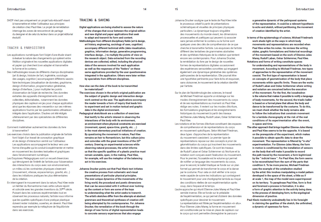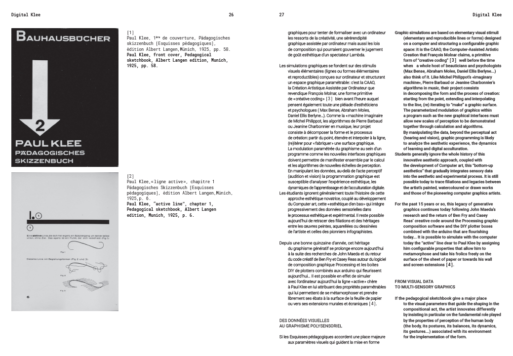 The DKEP project aims at the digital remediation of Pedagogical Sketchbook, a major work by Paul Klee published in 1925. In it, the artist presents his conception of art based on elementary plastic elements and relationships that he articulates in a series of creative exercises for Bauhaus students. The book examines the creative process in the making with the help of graphics that schematize plastic and sensory games of balance, graphic movements in their relationship to the body and to the physical laws that govern nature.