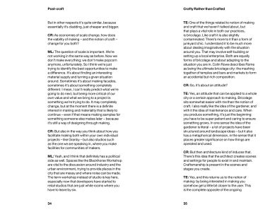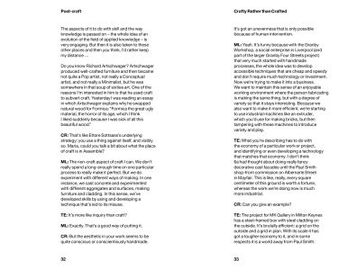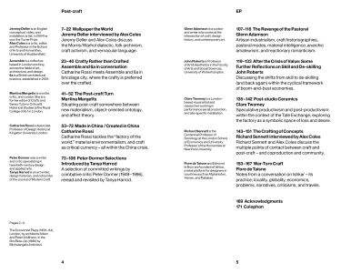 The notion of the handmade has shifted from the margins to center stage. Craft's value is increasingly recognized across creative, economic, social, cultural, and political contexts. Owing to dissolving disciplinary boundaries and the widespread appropriation of craft, its meaning is changing. While its claims to values such as authenticity and anti-consumerism are in question, the role of craft is poised to be optimized within the contemporary climate. Amid new economies of making, as craft moves from "modern craft" to "post-craft," we need to examine not only the practice of craft but also its mediation and interpretation