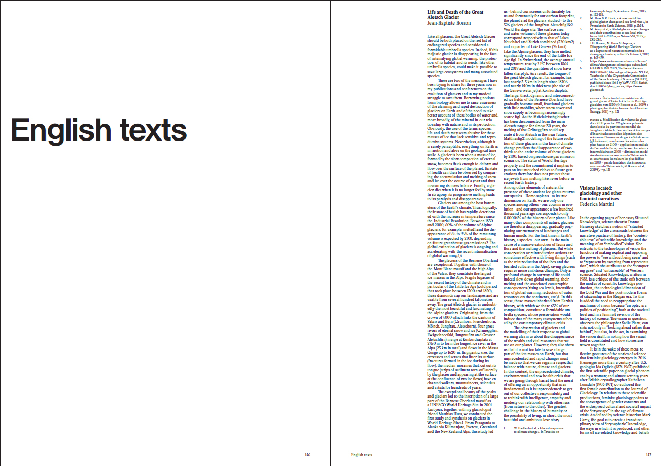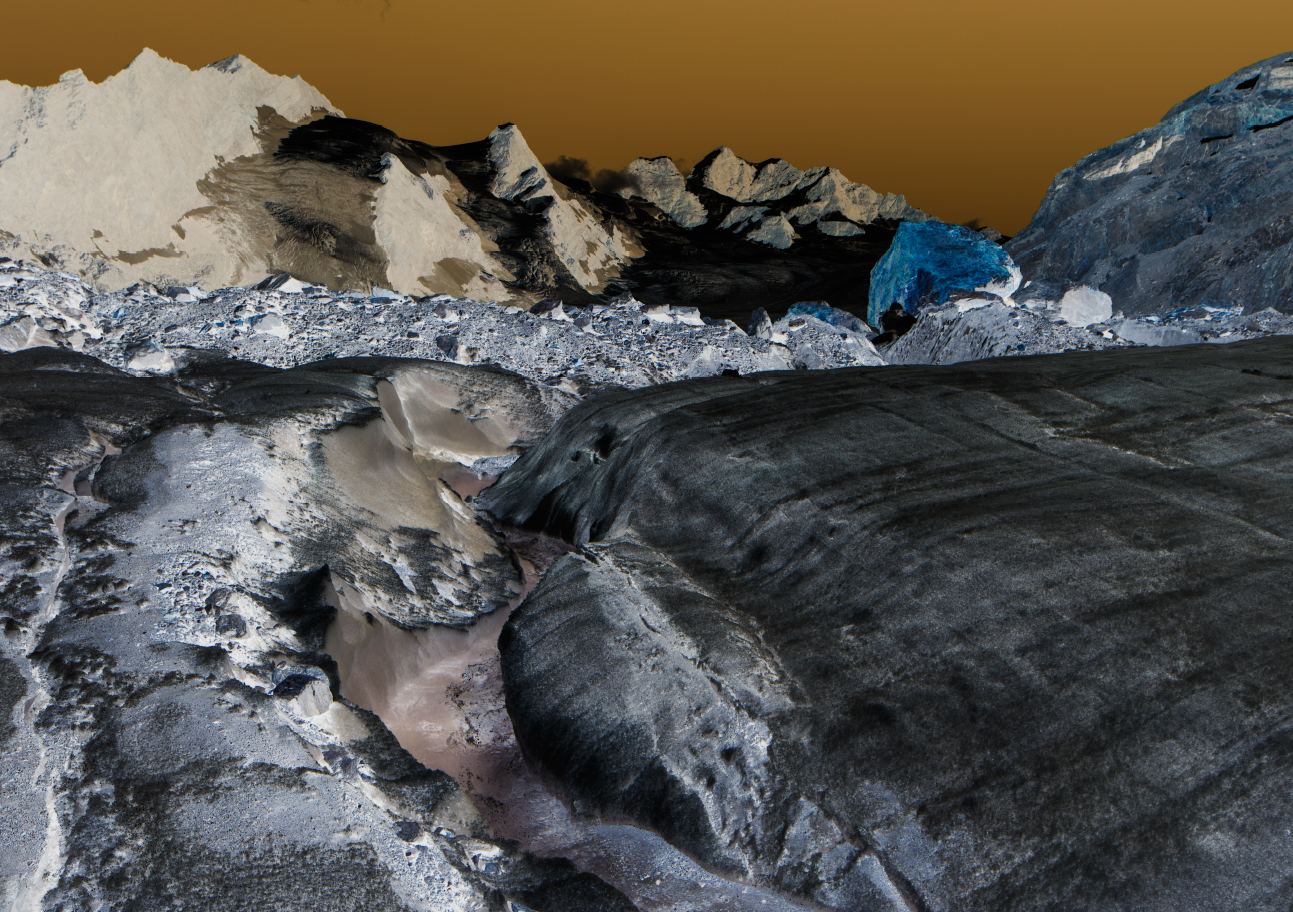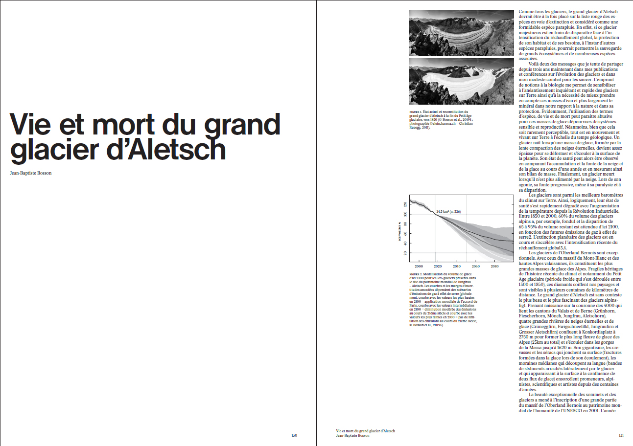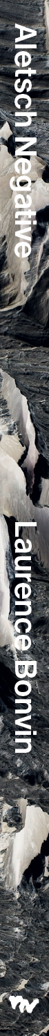 A photographic journey with a documentary and sensory approach in the center of the ice giant Aletsch, the biggest glacier in Europe (a series of 60 negative photographs taken on the Aletsch glacier, with four texts by interdisciplinary authors on the glacier: glaciologist Jean-Baptiste Bosson, art historians Federica Martini and Joël Vacheron and writer-researcher André Ourednik).
