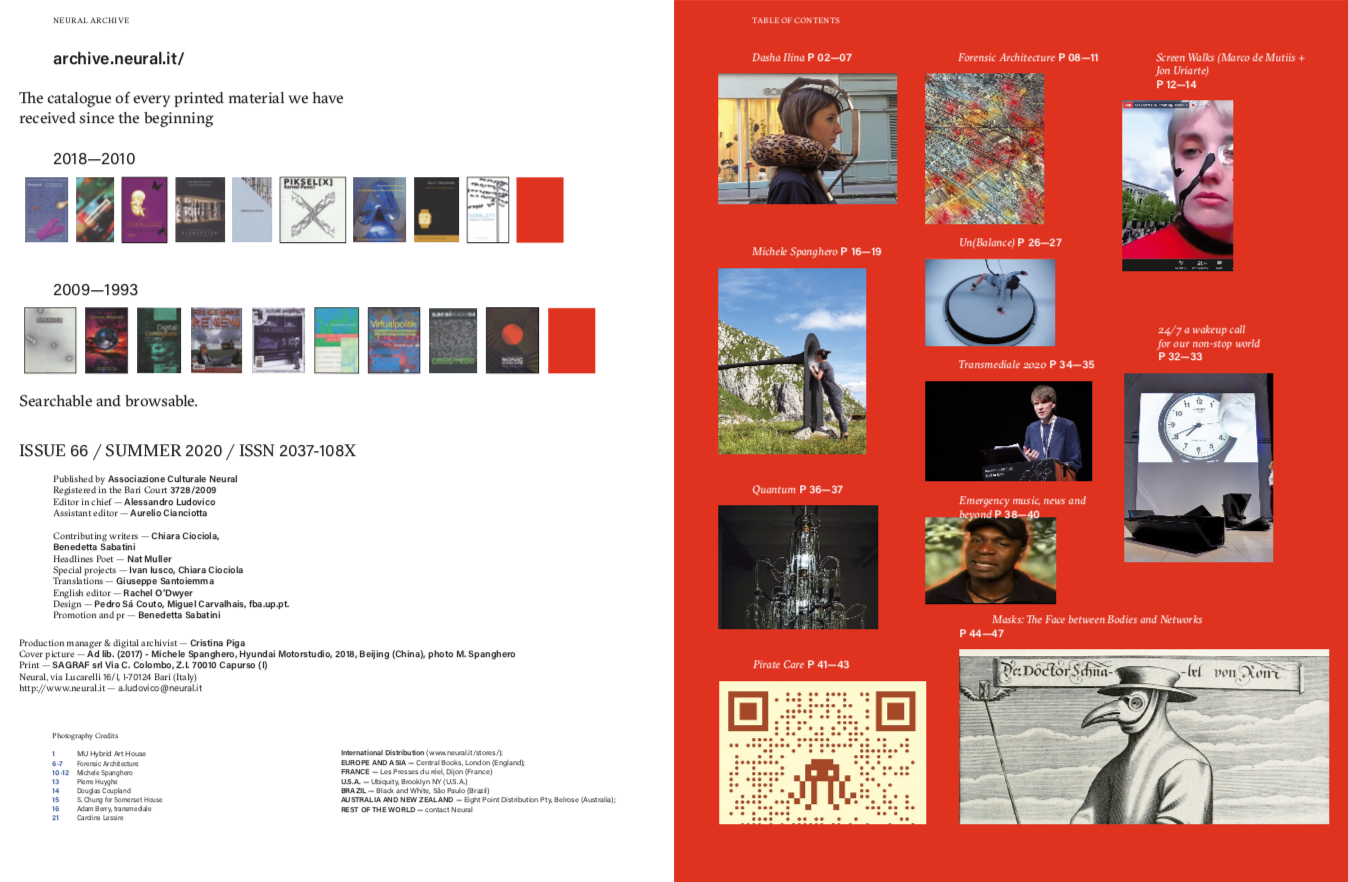 Neural was founded in 1993 by Alessandro Ludovico and Minus Habens Records label owner Ivan Iusco in Bari (Italy). The magazine's mission is to be a magazine of ideas, becoming a node in a larger network of digital culture publishers. The magazine is also committed to give its topics a proper visual frame: focusing on graphic design and how it could have expressed the electronic culture in a sort of printed “interface”, exploiting at the same time the “sensorial” possibilities of the printed page.