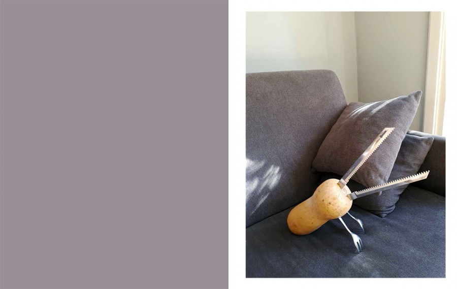 Photographic series by Philémon Vanorlé taken on smartphone in an apartment in Le Touquet-Paris-Plage from March 17th to May 11th 2020, period of lockdown imposed on the French population because of the pandemic (covid-19): offbeat and humorous assemblages of food and everyday objects that the artist creates.