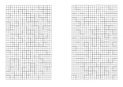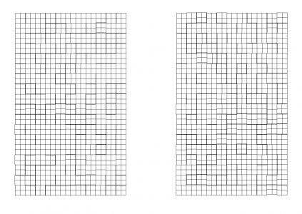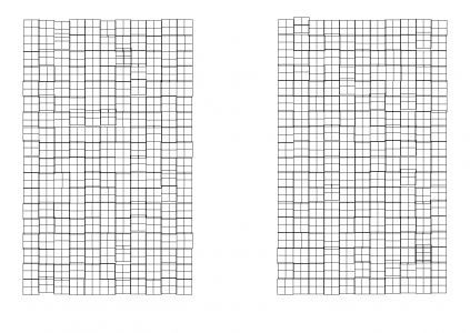 Carlos Bernal Ferrara illustrates the fluctuations induced by the printing of a PDF file by printing a square repeatedly until a grid is obtained. From the immaterial plane image to the printed tangible notebook, the physical factors related to the printer or the paper moved the lines. Through this gesture of repetition, the artist demonstrates that we will always obtained a different result even if the file is the same.