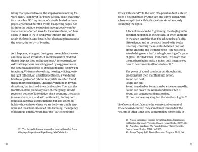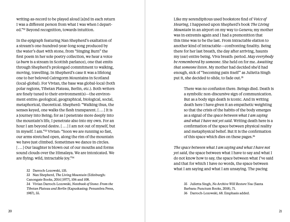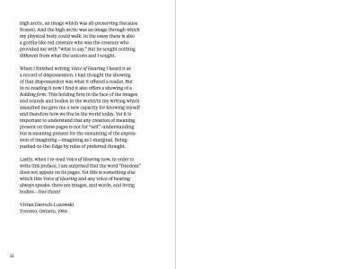"What is on these pages is what I am which is what I have never been": Vivian Darroch-Lozowski's meditation on coming into being through the act of writing is at once familiar scenario —a narrating of the process of creation— and distinctive unswerving unscrolling improvisation. Its visionary sensibility and self-exegesis and sheer blizzardy accumulation of word, image, observation, and insight attunes to the play of sound in ways that make radical modes of hearing fundamental to its ethos.
