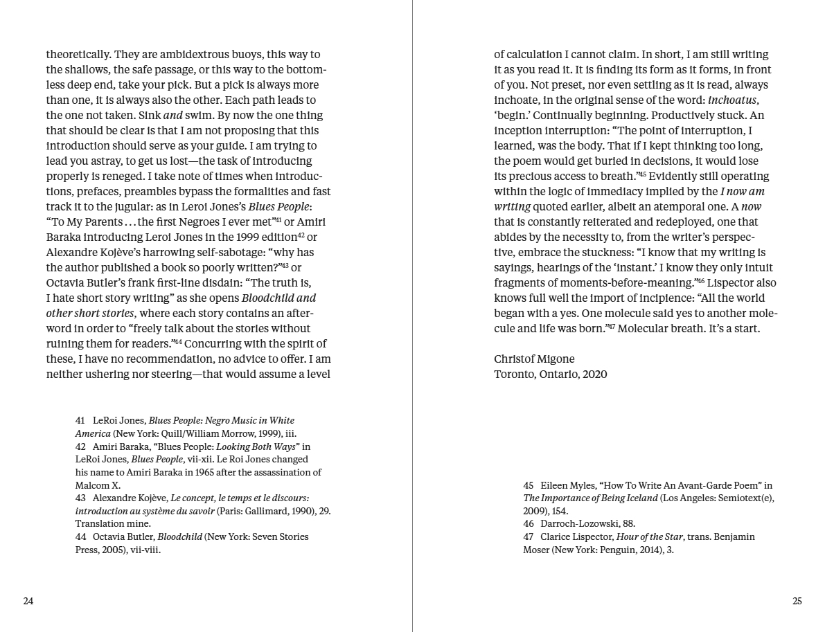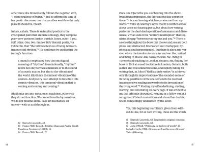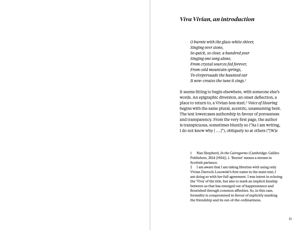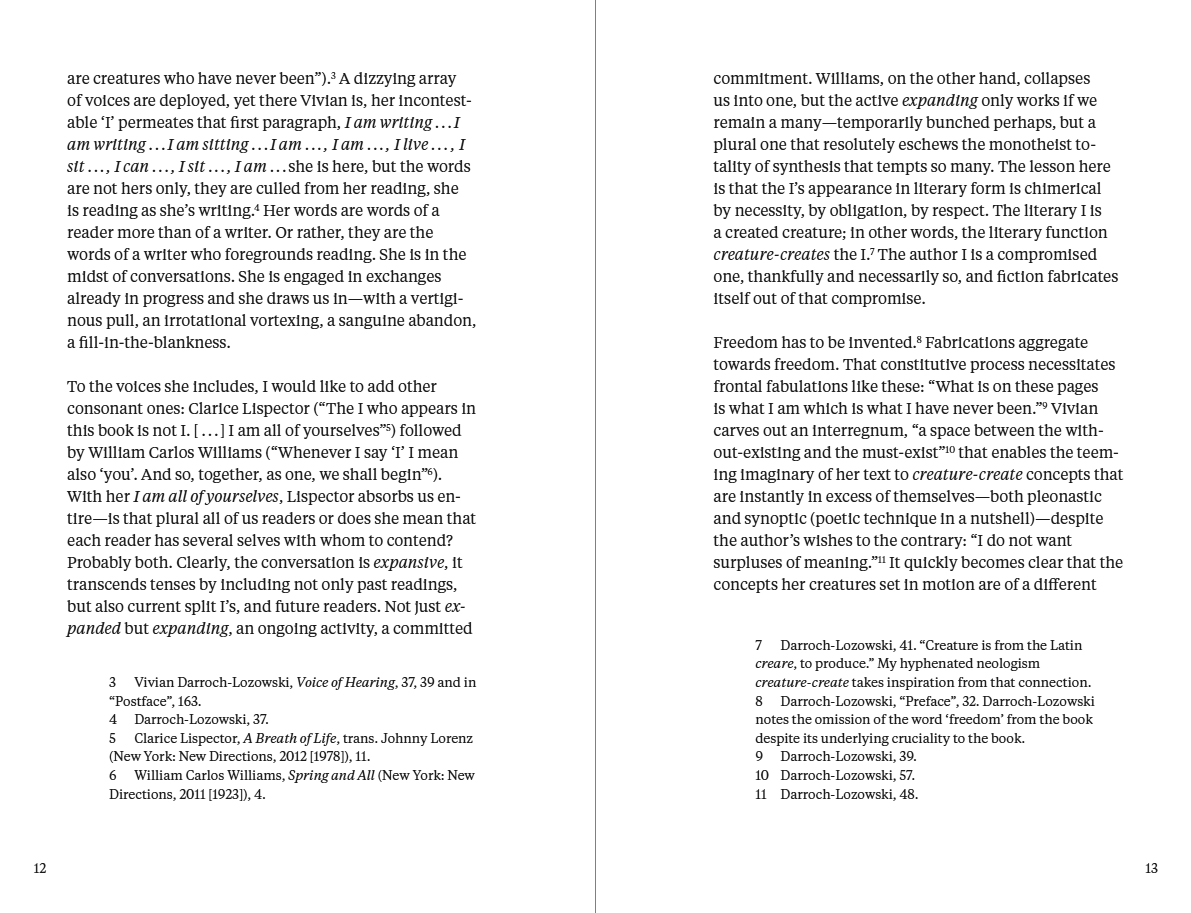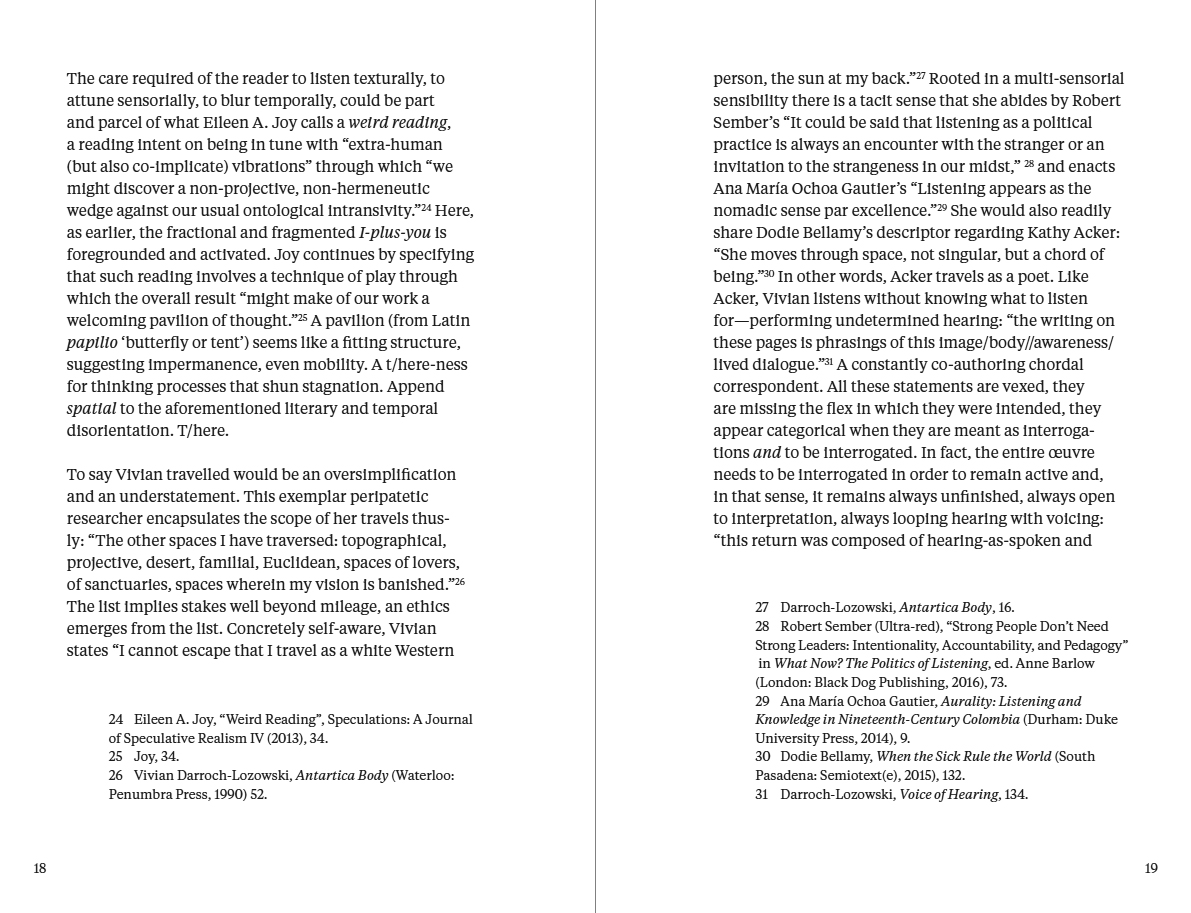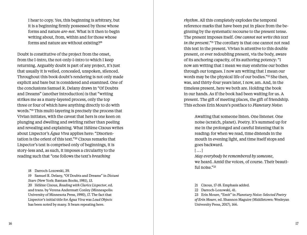 Voice of Hearing's key is that it is neither a book about voice nor hearing per se, but about how writing performs the dual-duel operation of assonance and dissonance, Vivian calls it the "unitary interruption" that regulates the gap "between you-my-me and you." There is a sense throughout the book that the me and you are both plural and abstracted, intersected and overlapped, hyphenated and hyperextended.[…] Doubt is constitutive of the project from the onset, from the I-intro, the not-only-I-intro to which I keep returning. Arguably doubt is part of any project, it's just that usually it is veiled, concealed, unspoken, silenced. Throughout this book doubt's rendering is not only made explicit and bare but is considered and examined. One of the conclusions Samuel R. Delany draws in "Of Doubts and Dreams" is that "writing strikes me as a many-layered process, only the top three or four of which have anything directly to do with words." This multi-layering is precisely the process that Vivian initiates, with the caveat that hers is one keen on plunging and dwelling and swirling rather than peeling and revealing and explaining. What Hélène Cixous writes about Lispector's