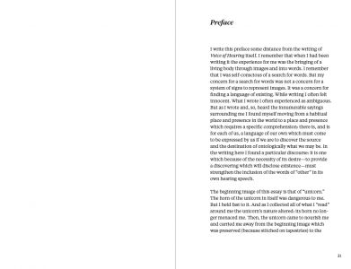 Contemplative, intricate, here the philosopher Vivian Darroch-Lozowski develops a phenomenology of hearing. Where theorizing is a present-tense action. Where a landscape teaches waiting. Where to be in a body is to gesture to another. Where subjectivity is the transformation of language. Where attention releases nascent energy. Where to hear is also to transform. Where myth is a gate. A close attending to this text, which is also a unicorn, will delicately open the reader's time-sense.