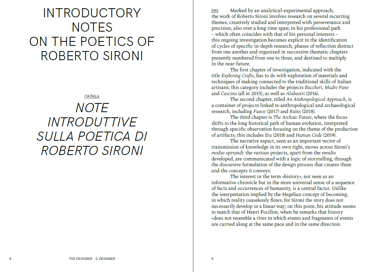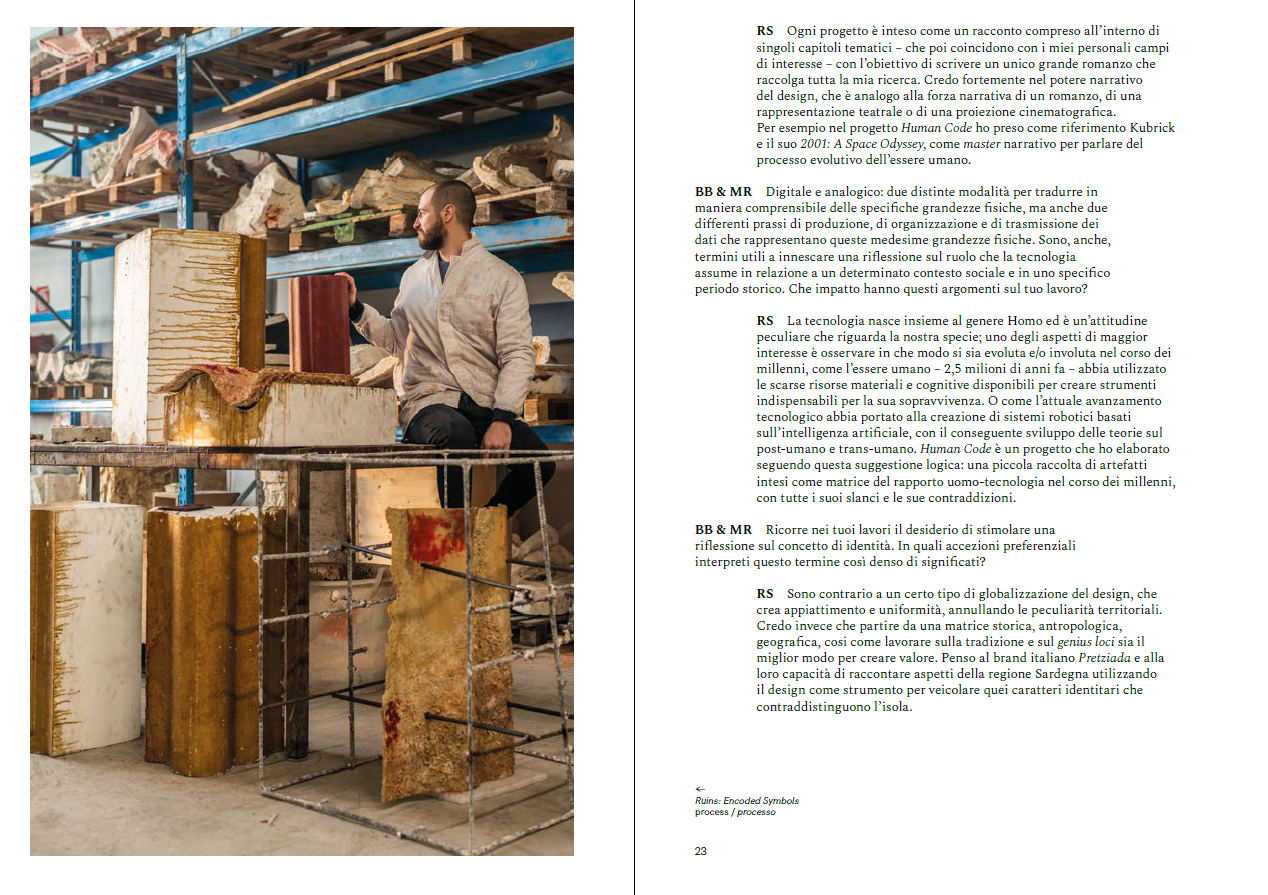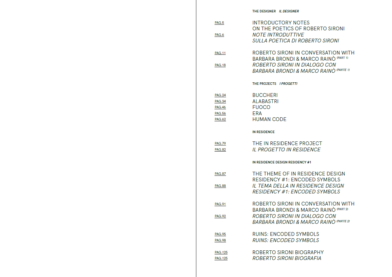 Illustrated by a rich photographic series, the book presents the results of Sironi's creative thought through some selected projects; written by Barbara Brondi & Marco Rainò, the volume recounts the experience of the Design Residency inspired by the theme "Encoded Symbols" Sironi has been the protagonist of, which is part of the broader project IN Residence, a research program dedicated to design that has elaborated new reflections in the field of education and training, as well as in the support and promotion of creative talent, through an intense and recognized activity.