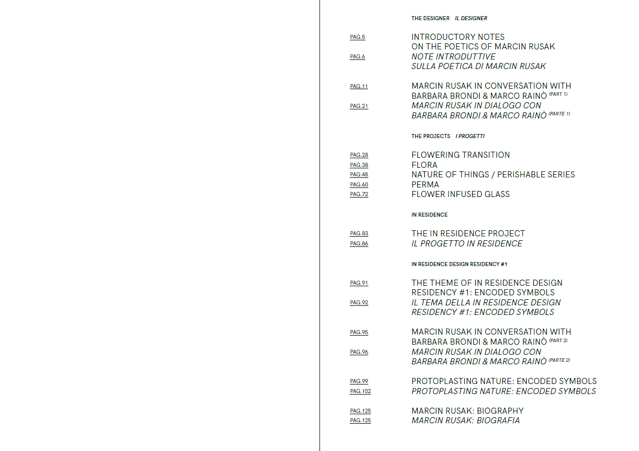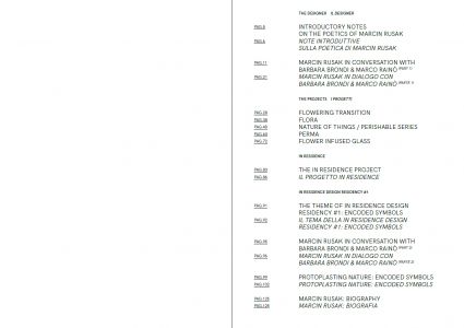 Illustrated by a rich photographic series, the book presents the results of Rusak's creative thought through some selected projects; written by Barbara Brondi & Marco Rainò, the volume recounts the experience of the Design Residency inspired by the theme "Encoded Symbols" Rusak was the protagonist of, which is part of the broader project IN Residence, a research program dedicated to design that has elaborated new reflections in the field of education and training, as well as in the support and promotion of creative talent, through an intense and recognized activity.